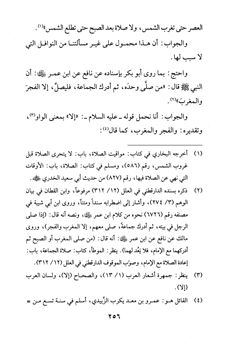 والجواب: أنا نحمل قوله - عليه السلام -: "إلا" بمعنى الواو (¬3)، وتقديره: والفجر والمغرب، كما قال (¬4):
