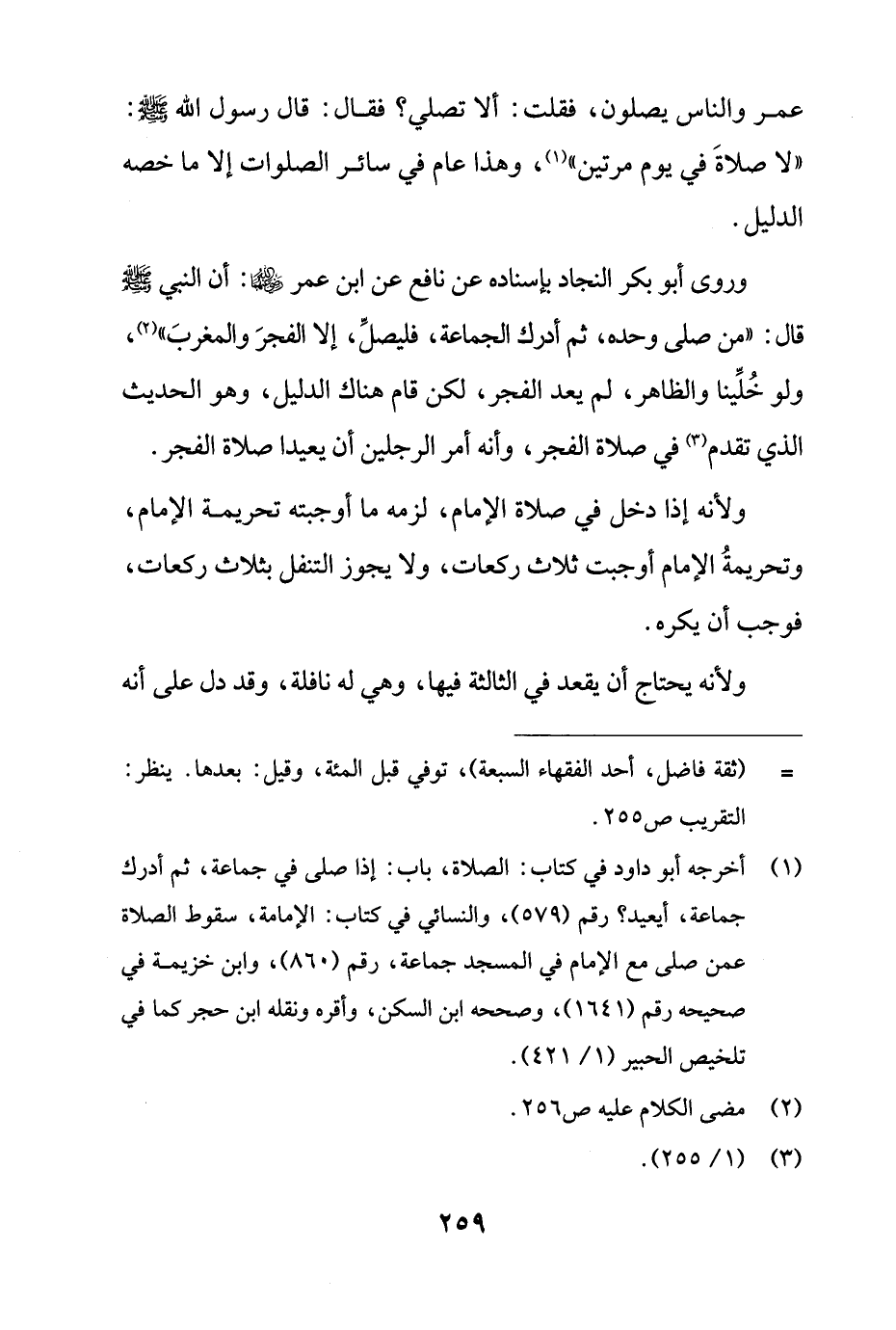 وروى أبو بكر النجاد بإسناده عن نافع عن ابن عمر - رضي الله عنهما -: أن النبي - صلى الله عليه وسلم - قال: "من صلى وحده، ثم أدرك الجماعة، فليصلِّ، إلا الفجرَ والمغربَ" (¬2)، ولو خُلِّينا والظاهر، لم يعد الفجر، لكن قام هناك الدليل، وهو الحديث الذي تقدم (¬3) في صلاة الفجر، وأنه أمر الرجلين أن يعيدا صلاة الفجر.