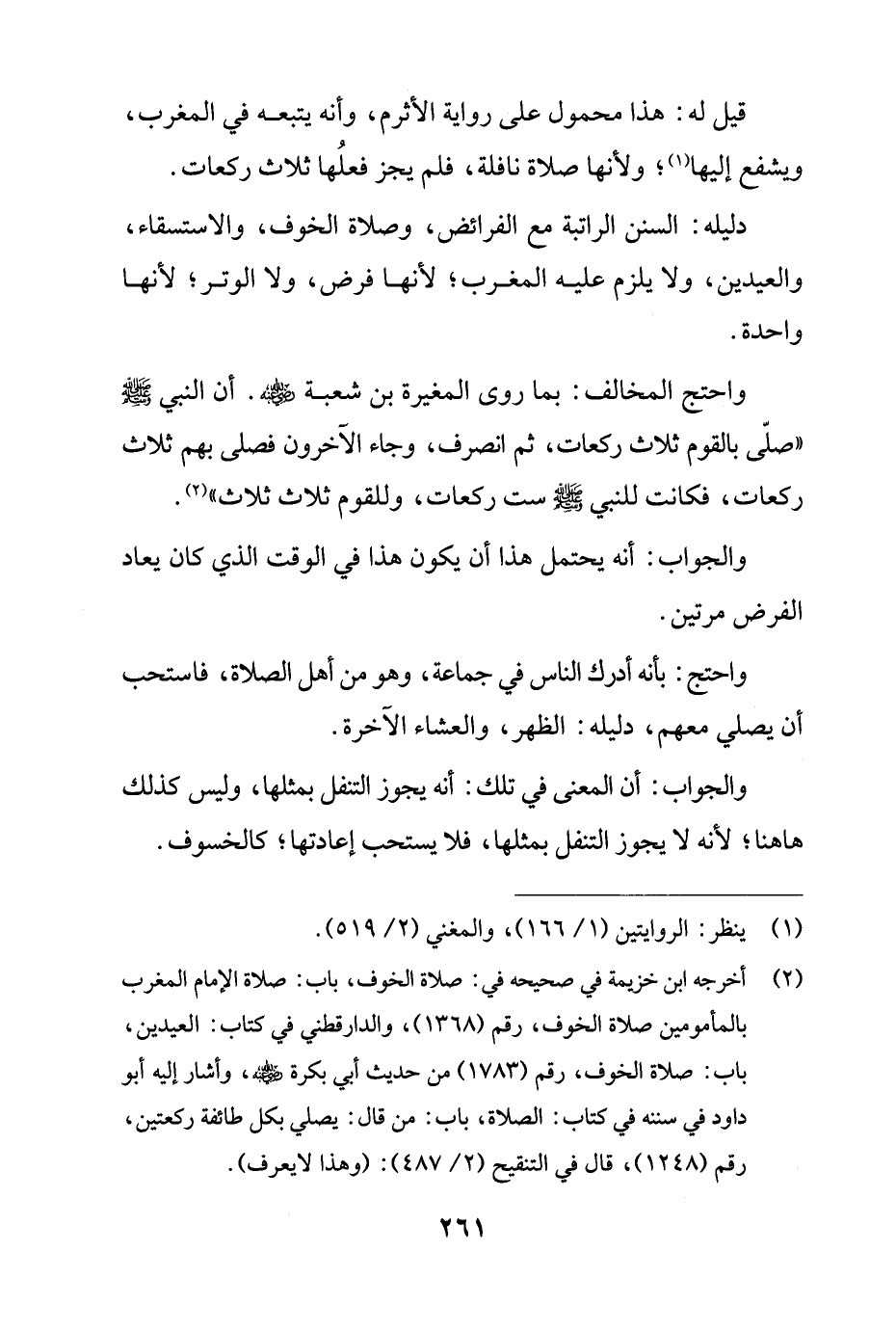 واحتج المخالف: بما روى المغيرة بن شعبة - رضي الله عنه -. أن النبي - صلى الله عليه وسلم - "صلّى بالقوم ثلاث ركعات، ثم انصرف، وجاء الآخرون فصلى بهم ثلاث ركعات، فكانت للنبي - صلى الله عليه وسلم - ست ركعات، وللقوم ثلاث ثلاث" (¬2).