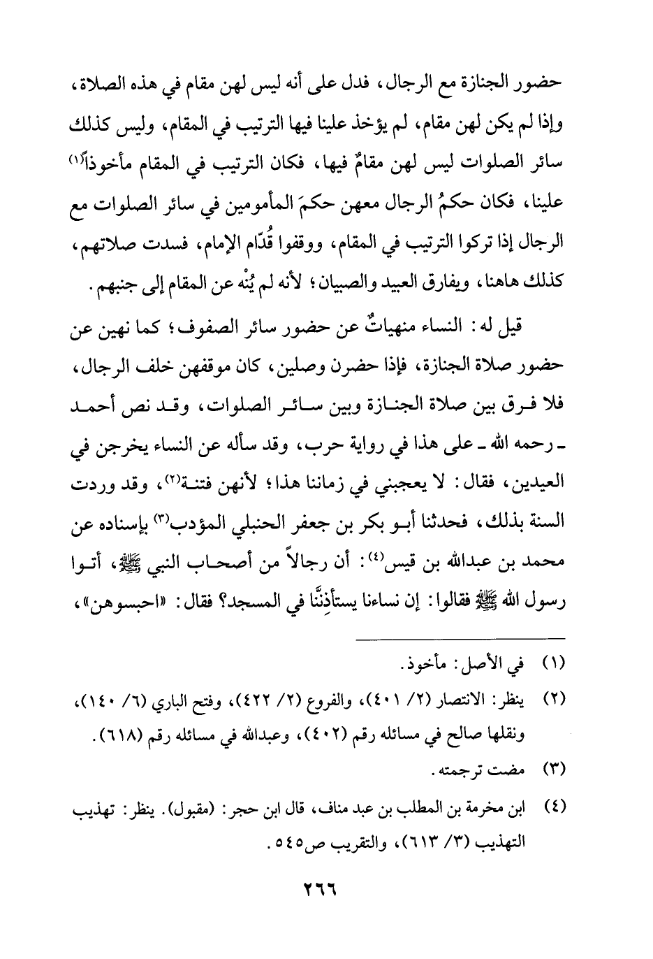 قيل له: النساء منهياتٌ عن حضور سائر الصفوف؛ كما نهين عن حضور صلاة الجنازة، فإذا حضرن وصلين، كان موقفهن خلف الرجال، فلا فرق بين صلاة الجنازة وبين سائر الصلوات، وقد نص أحمد - رحمه الله - على هذا في رواية حرب، وقد سأله عن النساء يخرجن في العيدين، فقال: لا يعجبني في زماننا هذا؛ لأنهن فتنة (¬2)، وقد وردت السنة بذلك، فحدثنا أبو بكر بن جعفر الحنبلي المؤدب (¬3) بإسناده عن محمد بن عبد الله بن قيس (¬4): أن رجالًا من أصحاب النبي - صلى الله عليه وسلم -، أتوا رسول الله - صلى الله عليه وسلم - فقالوا: إن نساءنا يستأذِنَّنا في المسجد؟ فقال: "احبسوهن"،