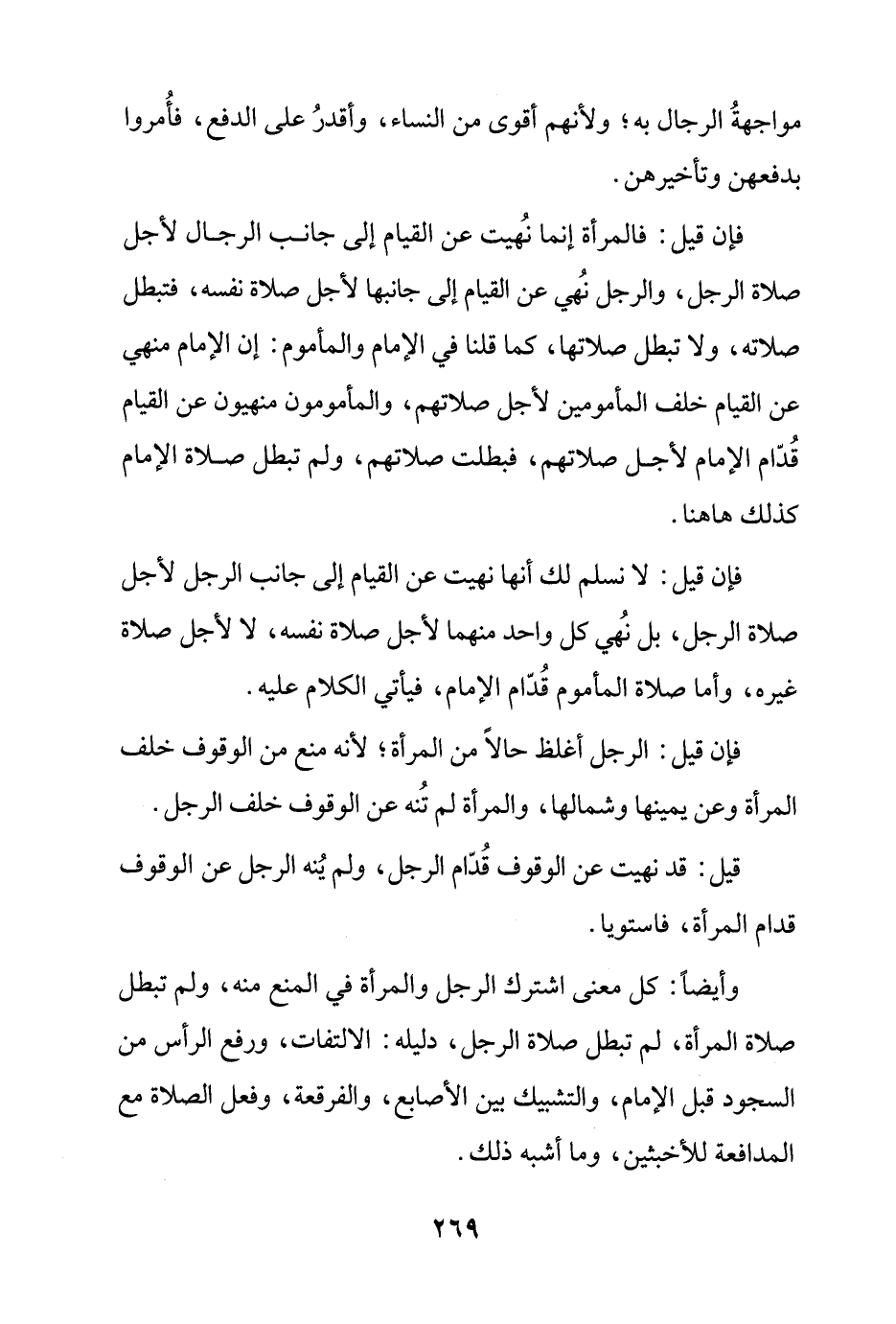 فإن قيل: فالمرأة إنما نُهيت عن القيام إلى جانب الرجال لأجل صلاة الرجل، والرجل نُهي عن القيام إلى جانبها لأجل صلاة نفسه، فتبطل صلاته، ولا تبطل صلاتها، كما قلنا في الإمام والمأموم: إن الإمام منهي عن القيام خلف المأمومين لأجل صلاتهم، والمأمومون منهيون عن القيام قُدّام الإمام لأجل صلاتهم، فبطلت صلاتهم، ولم تبطل صلاة الإمام كذلك ها هنا.