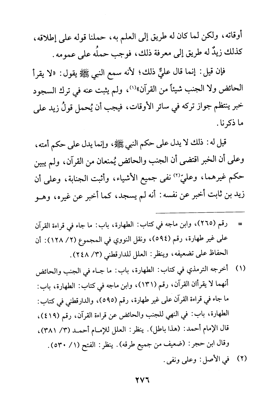 فإن قيل: إنما قال عليٌّ ذلك؛ لأنه سمع النبي - صلى الله عليه وسلم - يقول: "لا يقرأ الحائض ولا الجنب شيئًا من القرآن" (¬1)، ولم يثبت عنه في ترك السجود خبر ينتظم جواز تركه في سائر الأوقات، فيجب أن يُحمل قولُ زيد على ما ذكرنا.