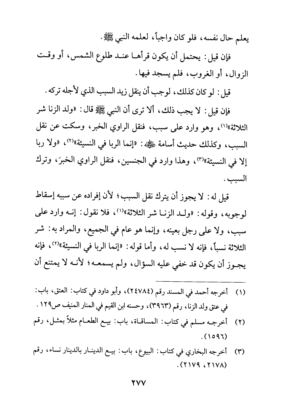قيل له: لا يجوز أن يترك نقل السبب؛ لأن إفراده عن سببه إسقاط لوجوبه، وقوله: "ولد الزنا شر الثلاثة" (1)، فلا نقول: إنه وارد على سبب، ولا على رجل بعينه، وإنما هو عام في الجميع، والمراد به: شر الثلاثة نسبًا، فإنه لا نسب له، وأما قوله: "إنما الربا في النسيئة" (2)، فإنه يجوز أن يكون قد خفي عليه السؤال، ولم يسمعه؛ لأنه لا يمتنع أن