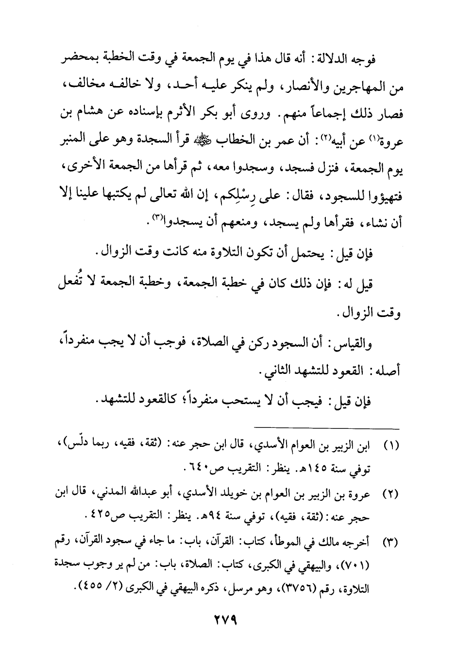 فوجه الدلالة: أنه قال هذا في يوم الجمعة في وقت الخطبة بمحضر من المهاجرين والأنصار، ولم ينكر عليه أحد، ولا خالفه مخالف، فصار ذلك إجماعًا منهم. وروى أبو بكر الأثرم بإسناده عن هشام بن عروة (¬1) عن أبيه (¬2): أن عمر بن الخطاب - رضي الله عنه - قرأ السجدة وهو على المنبر يوم الجمعة، فنزل فسجد، وسجدوا معه، ثم قرأها من الجمعة الأخرى، فتهيؤوا للسجود، فقال: على رِسْلِكم، إن الله تعالى لم يكتبها علينا إلا أن نشاء، فقرأها ولم يسجد، ومنعهم أن يسجدوا (¬3).