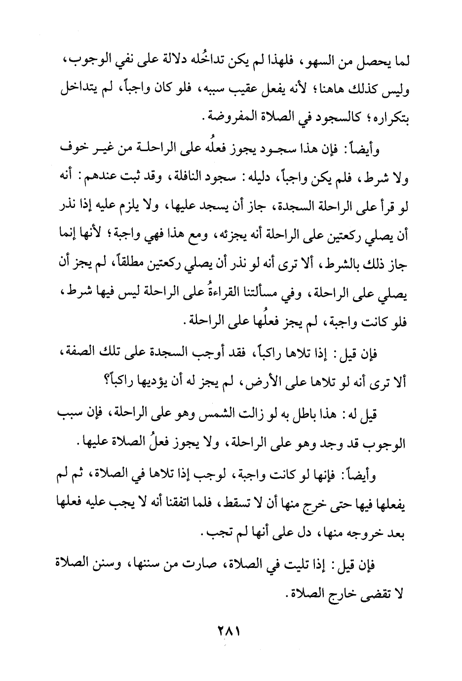 وأيضًا: فإن هذا سجود يجوز فعلُه على الراحلة من غير خوف ولا شرط، فلم يكن واجبًا، دليله: سجود النافلة، وقد ثبت عندهم: أنه لو قرأ على الراحلة السجدة، جاز أن يسجد عليها، ولا يلزم عليه إذا نذر أن يصلي ركعتين على الراحلة أنه يجزئه، ومع هذا فهي واجبة؛ لأنها إنما جاز ذلك بالشرط، ألا ترى أنه لو نذر أن يصلي ركعتين مطلقًا، لم يجز أن يصلي على الراحلة، وفي مسألتنا القراءةُ على الراحلة ليس فيها شرط، فلو كانت واجبة، لم يجز فعلُها على الراحلة.