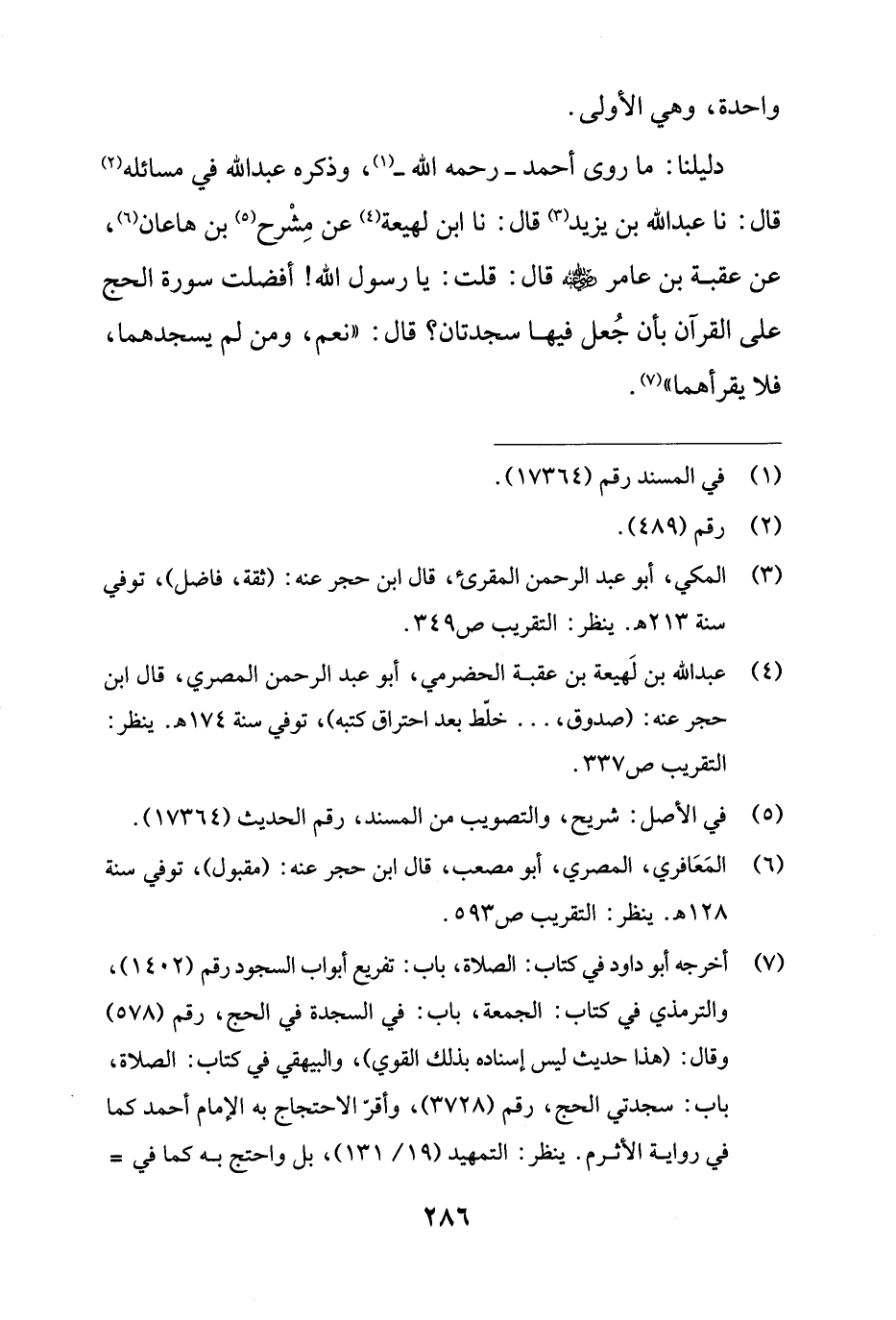 (¬7) أخرجه أبو داود في كتاب: الصلاة، باب: تفريع أبواب السجود رقم (1402)، والترمذي في كتاب: الجمعة، باب: في السجدة في الحج، رقم (578) وقال: (هذا حديث ليس إسناده بذلك القوي)، والبيهقي في كتاب: الصلاة، باب: سجدتي الحج، رقم (3728)، وأقرّ الاحتجاج به الإمام أحمد كما في رواية الأثرم. ينظر: التمهيد (19/ 131)، بل واحتج به كما في =