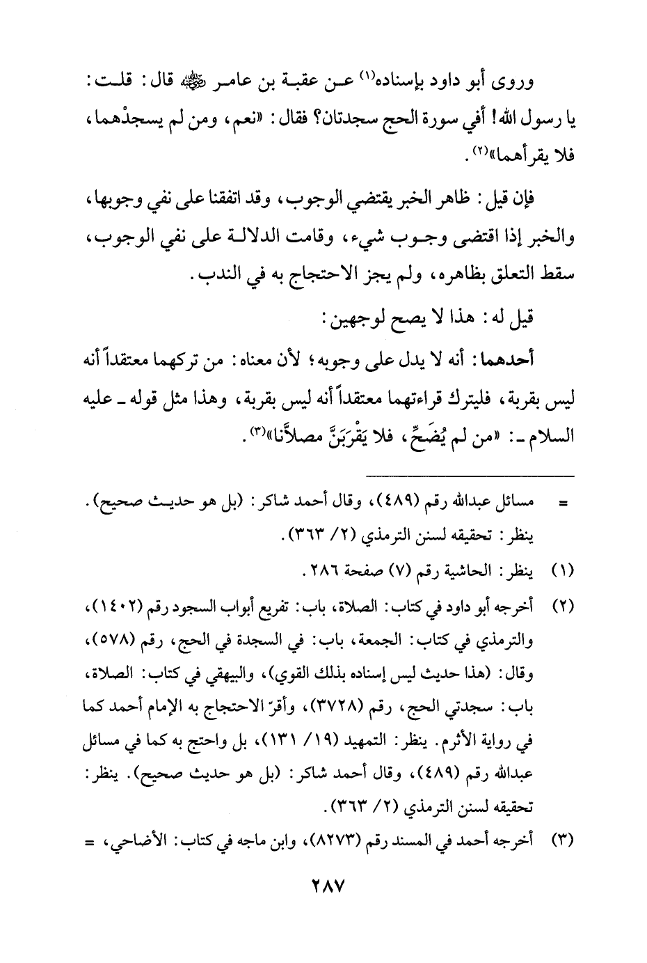 (¬2) أخرجه أبو داود في كتاب: الصلاة، باب: تفريع أبواب السجود رقم (1402)، والترمذي في كتاب: الجمعة، باب: في السجدة في الحج، رقم (578)، وقال: (هذا حديث ليس إسناده بذلك القوي)، والبيهقي في كتاب: الصلاة، باب: سجدتي الحج، رقم (3728)، وأقرّ الاحتجاج به الإمام أحمد كما في رواية الأثرم. ينظر: التمهيد (19/ 131)، بل واحتج به كما في مسائل عبد الله رقم (489)، وقال أحمد شاكر: (بل هو حديث صحيح). ينظر: تحقيقه لسنن الترمذي (2/ 363).