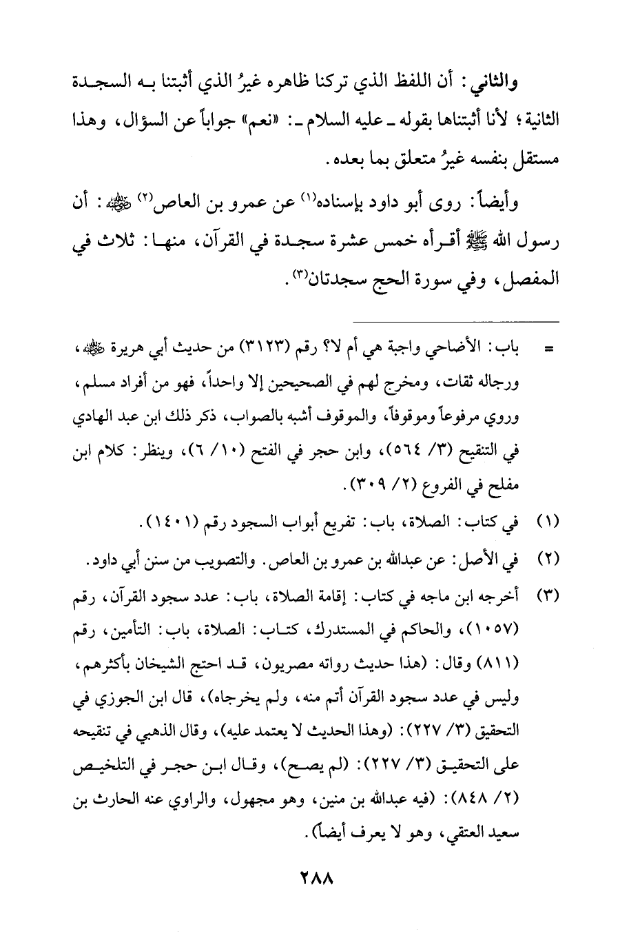 (¬3) أخرجه ابن ماجه في كتاب: إقامة الصلاة، باب: عدد سجود القرآن، رقم (1057)، والحاكم في المستدرك، كتاب: الصلاة، باب: التأمين، رقم (811) وقال: (هذا حديث رواته مصريون، قد احتج الشيخان بأكثرهم، وليس في عدد سجود القرآن أتم منه، ولم يخرجاه)، قال ابن الجوزي في التحقيق (3/ 227): (وهذا الحديث لا يعتمد عليه)، وقال الذهبي في تنقيحه على التحقيق (3/ 227): (لم يصح)، وقال ابن حجر في التلخيص (2/ 848): (فيه عبد الله بن منين، وهو مجهول، والراوي عنه الحارث بن سعيد العتقي، وهو لا يعرف أيضًا).