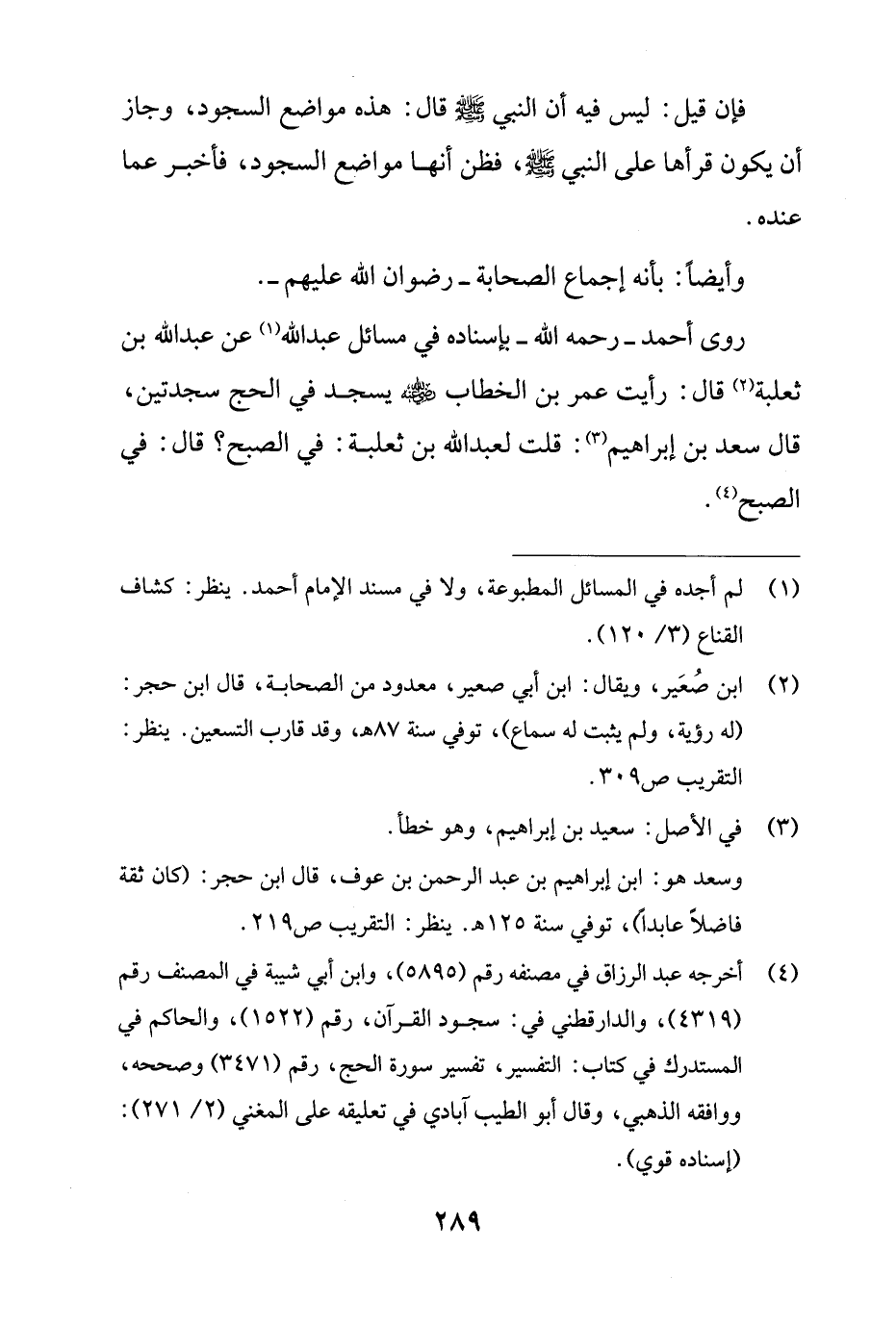 روى أحمد - رحمه الله - بإسناده في مسائل عبد الله (¬1) عن عبد الله بن ثعلبة (¬2) قال: رأيت عمر بن الخطاب - رضي الله عنه - يسجد في الحج سجدتين، قال سعد بن إبراهيم (¬3): قلت لعبد الله بن ثعلبة: في الصبح؟ قال: في الصبح (¬4).