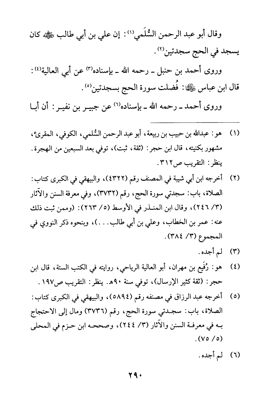 (¬5) أخرجه عبد الرزاق في مصنفه رقم (5894)، والبيهقي في الكبرى كتاب: الصلاة، باب: سجدتي سورة الحج، رقم (3736) ومال إلى الاحتجاج به في معرفة السنن والآثار (3/ 244)، وصححه ابن حزم في المحلى (5/ 75).