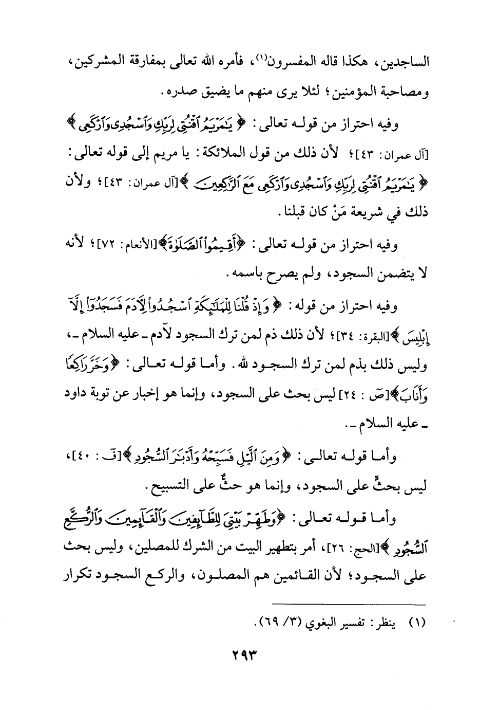 وأما قوله تعالى: {وَطَهِّرْ بَيْتِيَ لِلطَّائِفِينَ وَالْقَائِمِينَ وَالرُّكَّعِ السُّجُودِ} [الحج: 26]، أمر بتطهير البيت من الشرك للمصلين، وليس بحث على السجود؛ لأن القائمين هم المصلون، والركع السجود تكرار