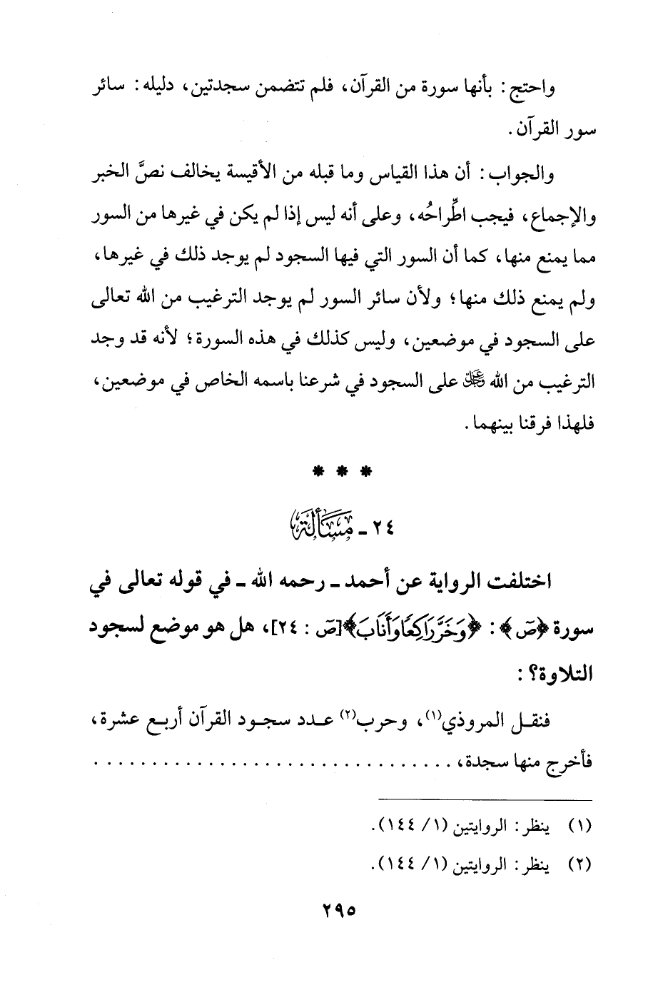 24 - مَسْألَة: اختلفت الرواية عن أحمد - رحمه الله - في قوله تعالى في سورة {ص}: {وَخَرَّ رَاكِعًا وَأَنَابَ} [ص: 24]، هل هو موضع لسجود التلاوة؟ :