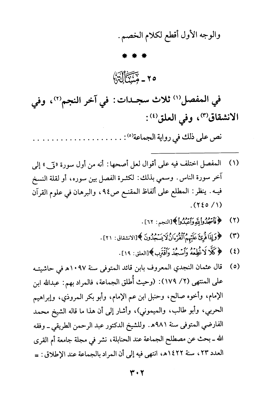 25 - مَسْألَة: في المفصل (¬1) ثلاث سجدات: في آخر النجم (¬2)، وفي الانشقاق (¬3)، وفي العلق (¬4):