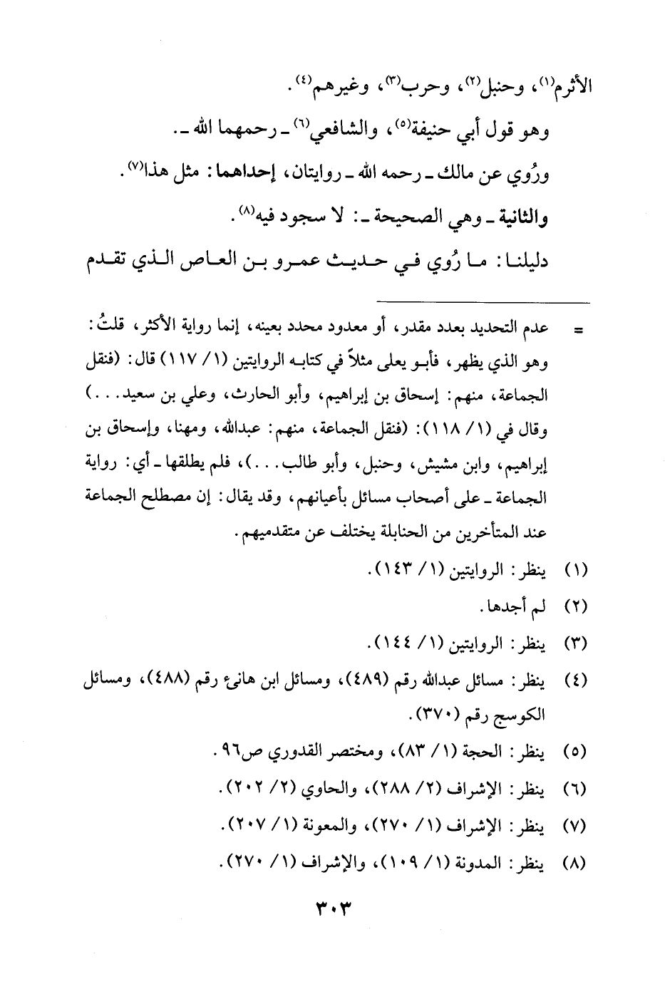= عدم التحديد بعدد مقدر، أو معدود محدد بعينه، إنما رواية أكثر، قلتُ: وهو الذي يظهر، فأبو يعلى مثلًا في كتابه الروايتين (1/ 117) قال: (فنقل الجماعة، منهم: إسحاق بن إبراهيم، وأبو الحارث، وعلي بن سعيد ... ) وقال في (1/ 118): (فنقل الجماعة، منهم: عبد الله، ومهنا، وإسحاق بن إبراهيم، وابن مشيش، وحنبل، وأبو طالب ... )، فلم يطلقها - أي: رواية الجماعة - على أصحاب مسائل بأعيانهم، وقد يقال: إن مصطلح الجماعة عند المتأخرين من الحنابلة يختلف عن متقدميهم.