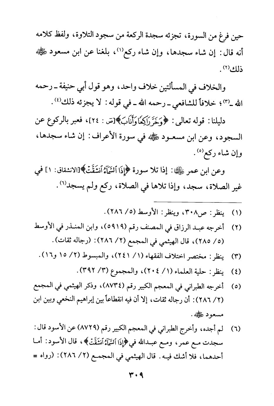 (¬6) لم أجده، وأخرج الطبراني في المعجم الكبير رقم (8729) عن الأسود قال: سجدت مع عمر، ومع عبد الله في {إِذَا السَّمَاءُ انْشَقَّتْ}، قال الأسود: أما أحدهما، فلا أشك فيه. قال الهيثمي في المجمع (2/ 286): (رواه =