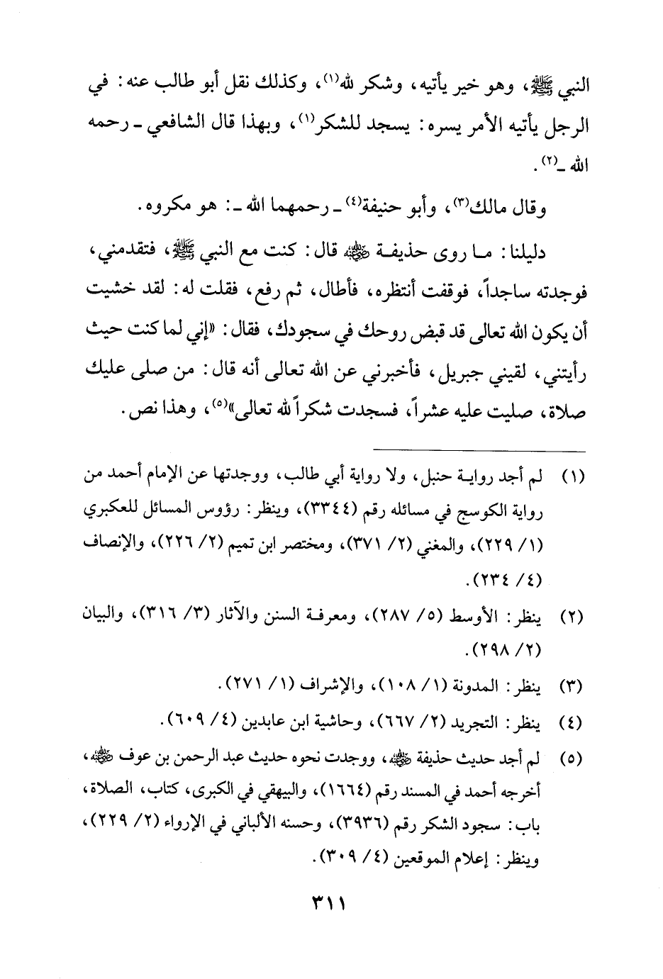 (¬5) لم أجد حديث حذيفة - رضي الله عنه -، ووجدت نحوه حديث عبد الرحمن بن عوف - رضي الله عنه -، أخرجه أحمد في المسند رقم (1664)، والبيهقي في الكبرى، كتاب، الصلاة، باب: سجود الشكر رقم (3936)، وحسنه الألباني في الإرواء (2/ 229)، وينظر: إعلام الموقعين (4/ 309).