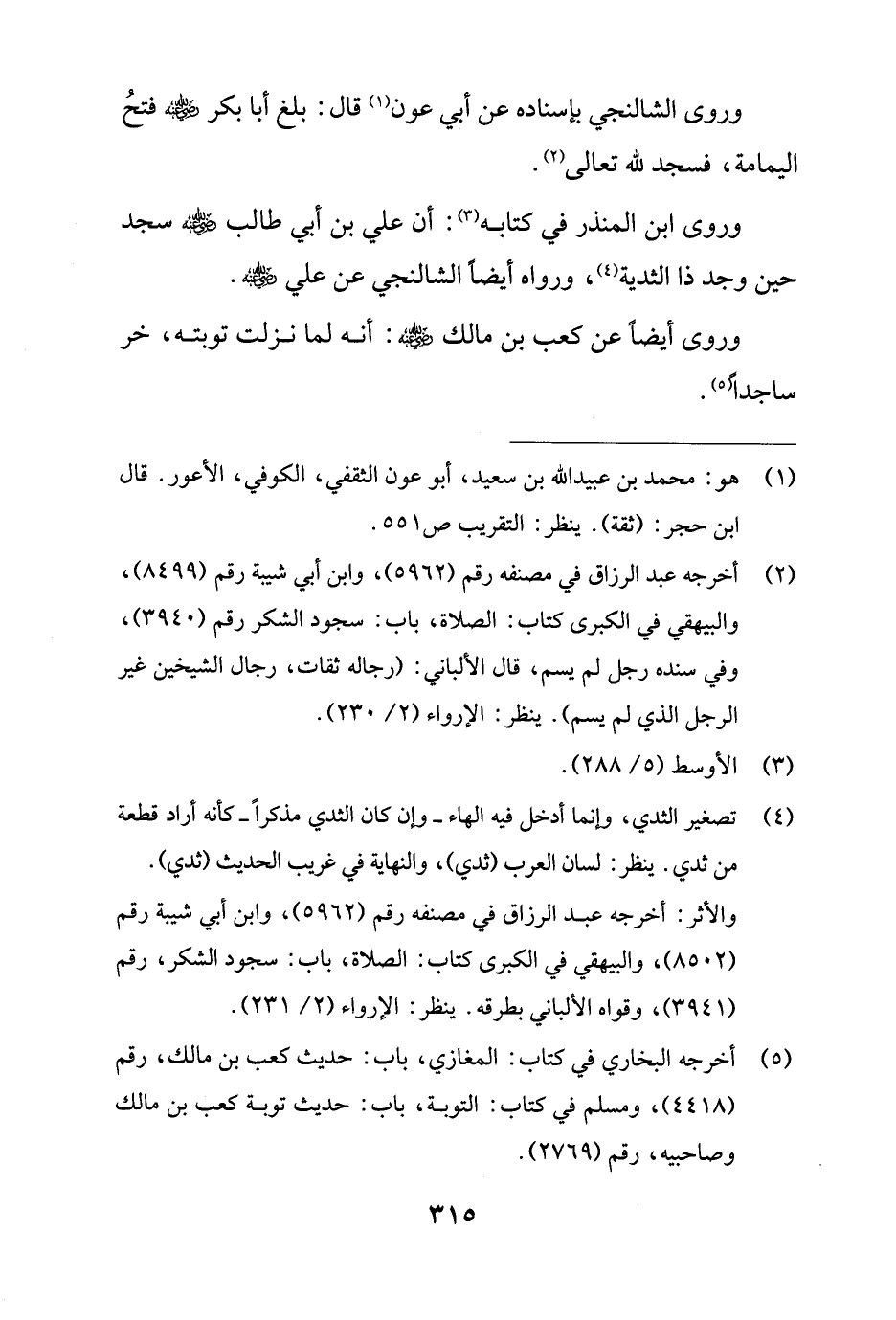 (¬2) أخرجه عبد الرزاق في مصنفه رقم (5962)، وابن أبي شيبة رقم (8499)، والبيهقي في الكبرى كتاب: الصلاة، باب: سجود الشكر رقم (3940)، وفي سنده رجل لم يسم، قال الألباني: (رجاله ثقات، رجال الشيخين غير الرجل الذي لم يسم). ينظر: الإرواء (2/ 230).