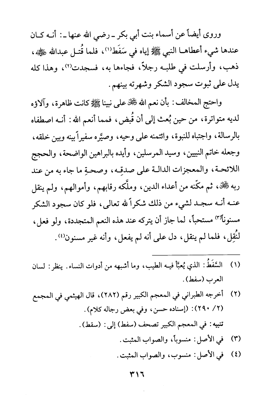 وروى أيضًا عن أسماء بنت أبي بكر - رضي الله عنها -: أنه كان عندها شيء أعطاها النبي - صلى الله عليه وسلم - إياه في سَفَط (¬1)، فلما قُتل عبد الله - رضي الله عنه -، ذهب، وأرسلت في طلبه رجلًا، فجاءها به، فسجدت (¬2)، وهذا كله يدل على ثبوت سجود الشكر وشهرته بينهم.