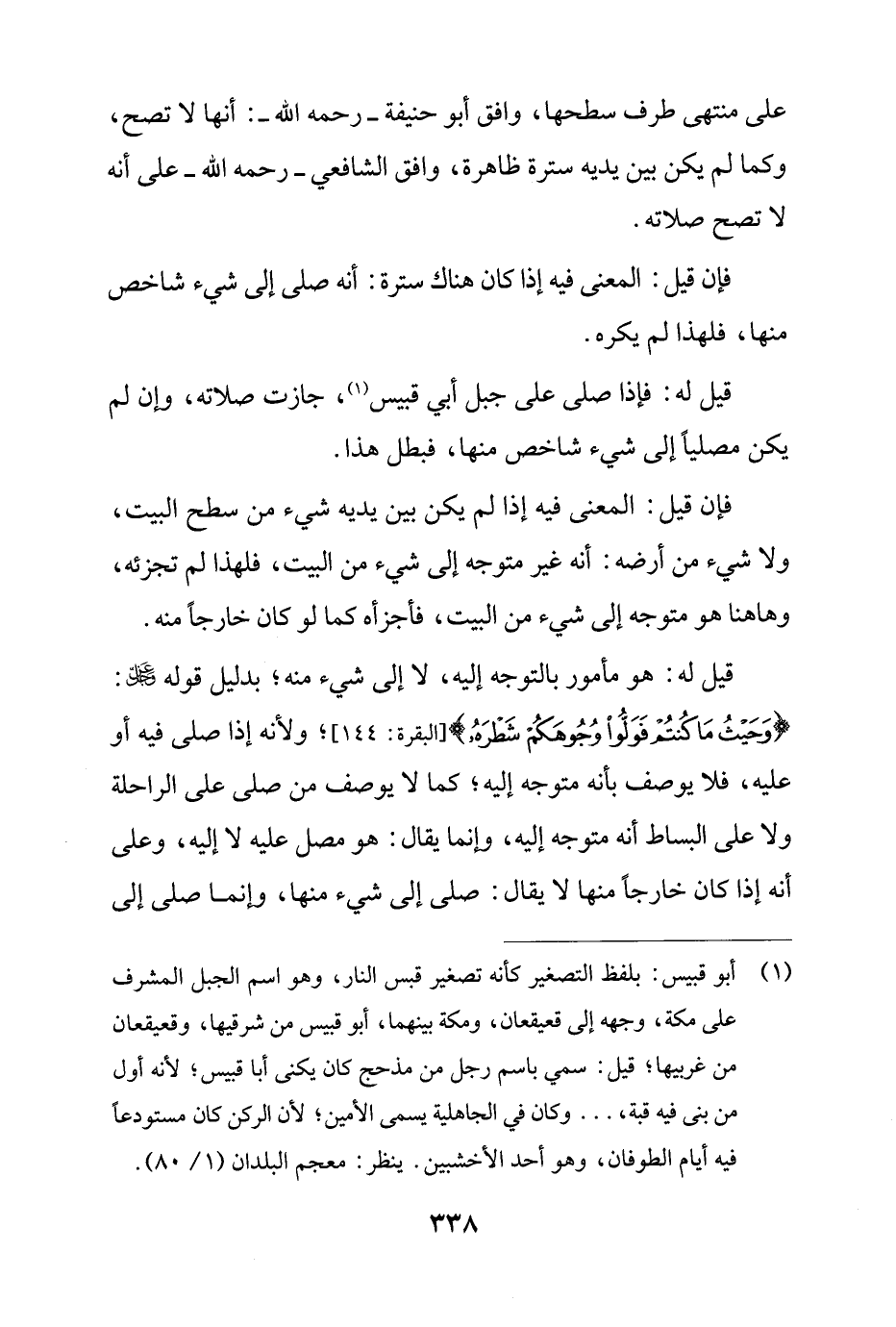 قيل له: هو مأمور بالتوجه إليه، لا إلى شيء منه؛ بدليل قوله - عز وجل -: {وَحَيْثُ مَا كُنْتُمْ فَوَلُّوا وُجُوهَكُمْ شَطْرَهُ} [البقرة: 144]؛ ولأنه إذا صلى فيه أو عليه، فلا يوصف بأنه متوجه إليه؛ كما لا يوصف من صلى على الراحلة ولا على البساط أنه متوجه إليه، وإنما يقال: هو مصل عليه لا إليه، وعلى أنه إذا كان خارجًا منها لا يقال: صلى إلى شيء منها، وإنما صلى إلى