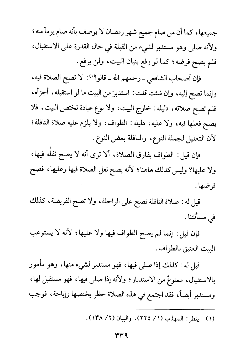 فإن أصحاب الشافعي - رحمهم الله - قالوا (¬1): لا تصح الصلاة فيه، وإنما تصح إليه، وإن شئت قلت: استدبرَ من البيت ما لو استقبله، أجزأه، فلم تصح صلاته، دليله: خارج البيت، ولا نوع عبادة تختص البيت، فلا يصح فعلها فيه، ولا عليه، دليله: الطواف، ولا يلزم عليه صلاة النافلة؛ لأن التعليل لجملة النوع، والنافلة بعض النوع.