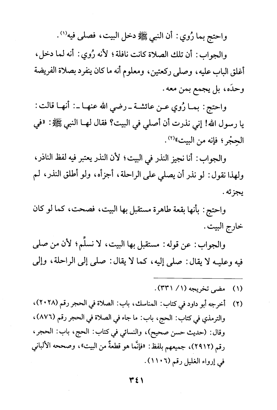 (¬2) أخرجه أبو داود في كتاب: المناسك، باب: الصلاة في الحجر رقم (2028)، والترمذي في كتاب: الحج، باب: ما جاء في الصلاة في الحجر رقم (876)، وقال: (حديث حسن صحيح)، والنسائي في كتاب: الحج، باب: الحجر، رقم (2912)، جميعهم بلفظ: "فإنَّما هو قطعة من البيت"، وصححه الألباني في إرواء الغليل رقم (1106).