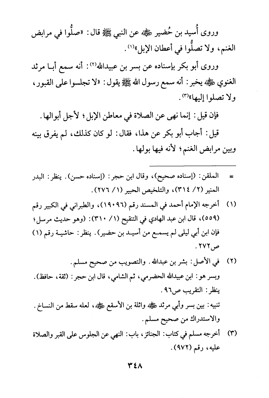 وروى أُسيد بن حُضير - رضي الله عنه - عن النبي - صلى الله عليه وسلم - قال: "صلُّوا في مرابض الغنم، ولا تصلُّوا في أعطان الإبل" (¬1).