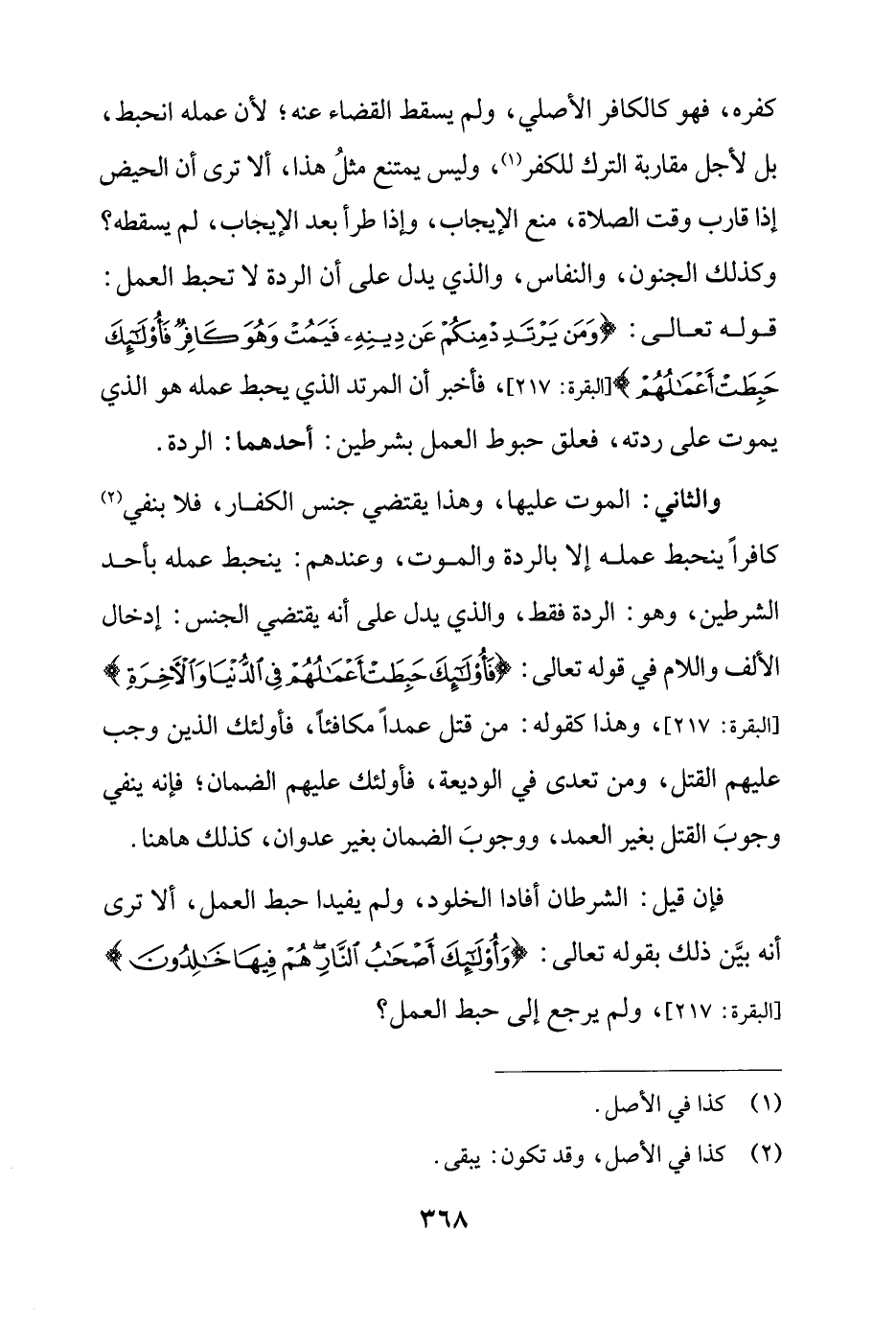 والثاني: الموت عليها، وهذا يقتضي جنس الكفار، فلا بنفي (¬2) كافرًا ينحبط عمله إلا بالردة والموت، وعندهم: ينحبط عمله بأحد الشرطين، وهو: الردة فقط، والذي يدل على أنه يقتضي الجنس: إدخال الألف واللام في قوله تعالى: {فَأُولَئِكَ حَبِطَتْ أَعْمَالُهُمْ فِي الدُّنْيَا وَالْآخِرَةِ} [البقرة: 217]، وهذا كقوله: من قتل عمدًا مكافئًا، فأولئك الذين وجب عليهم القتل، ومن تعدى في الوديعة، فأولئك عليهم الضمان؛ فإنه ينفي وجوبَ القتل بغير العمد، ووجوبَ الضمان بغير عدوان، كذلك ها هنا.