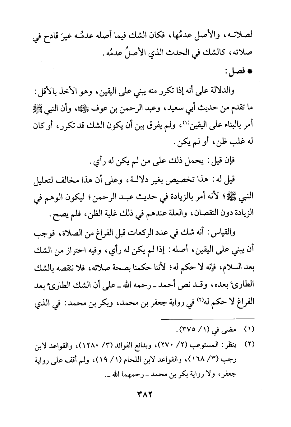 والدلالة على أنه إذا تكرر منه يبني على اليقين، وهو الأخذ بالأقل: ما تقدم من حديث أبي سعيد، وعبد الرحمن بن عوف - رضي الله عنهما -، وأن النبي - صلى الله عليه وسلم - أمر بالبناء على اليقين (¬1)، ولم يفرق بين أن يكون الشك قد تكرر، أو كان له غلب ظن، أو لم يكن.