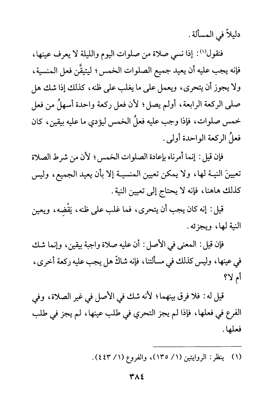 فنقول (¬1): إذا نسي صلاة من صلوات اليوم والليلة لا يعرف عينها، فإنه يجب عليه أن يعيد جميع الصلوات الخمس؛ ليتيقَّن فعل المنسية، ولا يجوز أن يتحرى، ويعمل على ما يغلب على ظنه، كذلك إذا شك هل صلى الركعة الرابعة، أو لم يصل؛ لأن فعل ركعة واحدة أسهلُ من فعل خمس صلوات، فإذا وجب عليه فعلُ الخمس ليؤدي ما عليه بيقين، كان فعلُ الركعة الواحدة أولى.