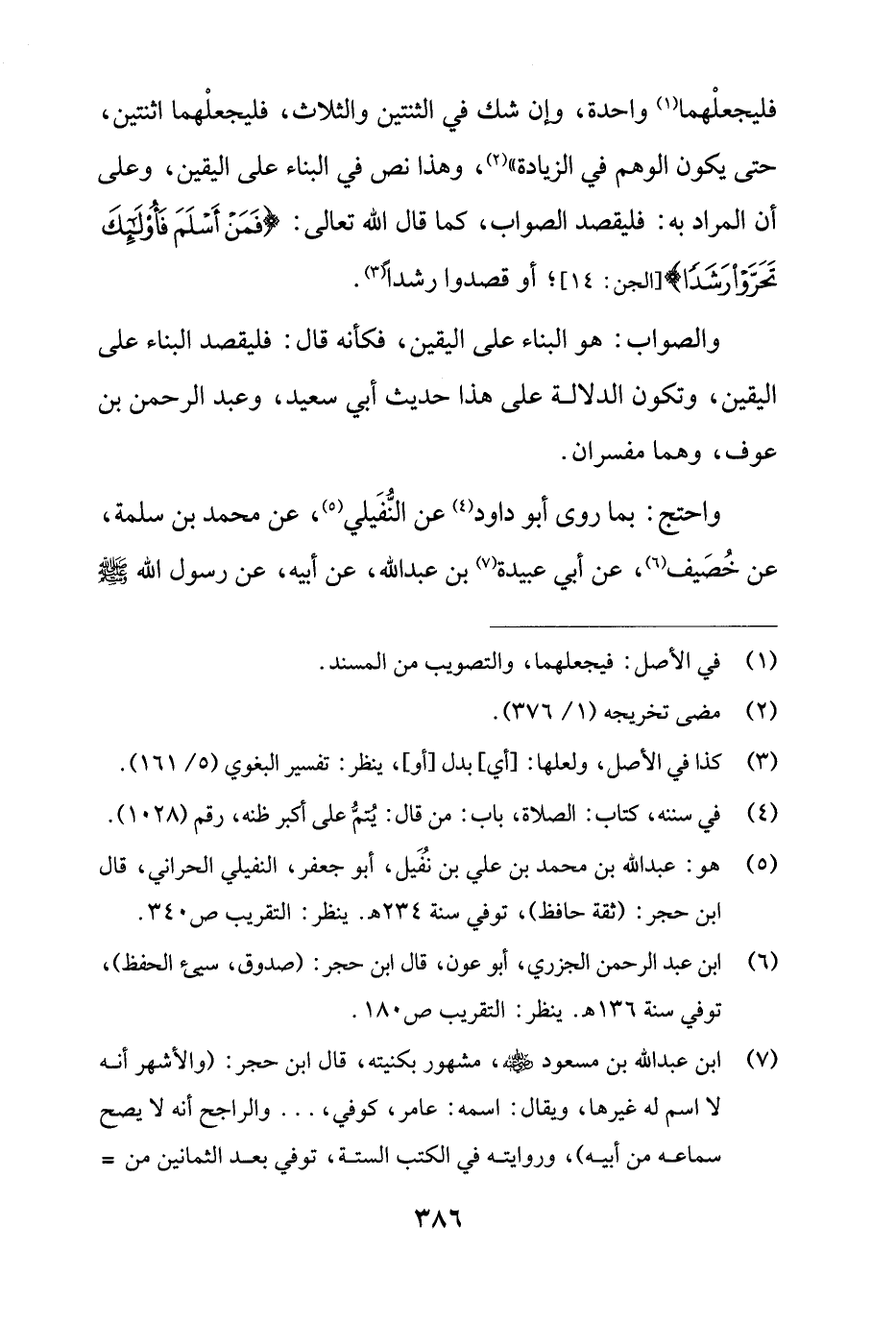 والصواب: هو البناء على اليقين، فكأنه قال: فليقصد البناء على اليقين، وتكون الدلالة على هذا حديث أبي سعيد، وعبد الرحمن بن عوف، وهما مفسران.