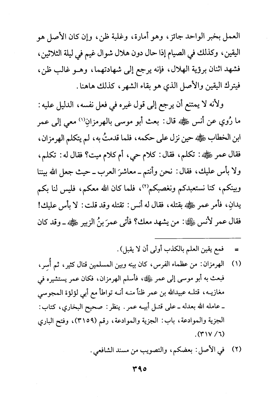 ولأنه لا يمتنع أن يرجع إلى قول غيره في فعل نفسه، الدليل عليه: ما رُوي عن أنس - رضي الله عنه - قال: بعث أبو موسى بالهرمزانِ (¬1) معي إلى عمر بن الخطاب - رضي الله عنه - حين نزل على حكمه، فلما قدمتُ به، لم يتكلم الهرمزان، فقال عمر - رضي الله عنه -: تكلم، فقال: كلام حي، أم كلام ميت؟ فقال له: تكلم، ولا بأس عليك، فقال: نحن وأنتم - معاشرَ العرب - حيث جعل الله بيننا وبينكم، كنا نستعبدكم ونغصبكم (¬2)، فلما كان الله معكم، فليس لنا بكم يدانِ، فأمر عمر - رضي الله عنه - بقتله، فقال له أنس: تقتله وقد قلت: لا بأس عليك! فقال عمر لأنس - رضي الله عنهما -: من يشهد معك؟ فأتى عمرَ بنُ الزبير - رضي الله عنه - وقد كان