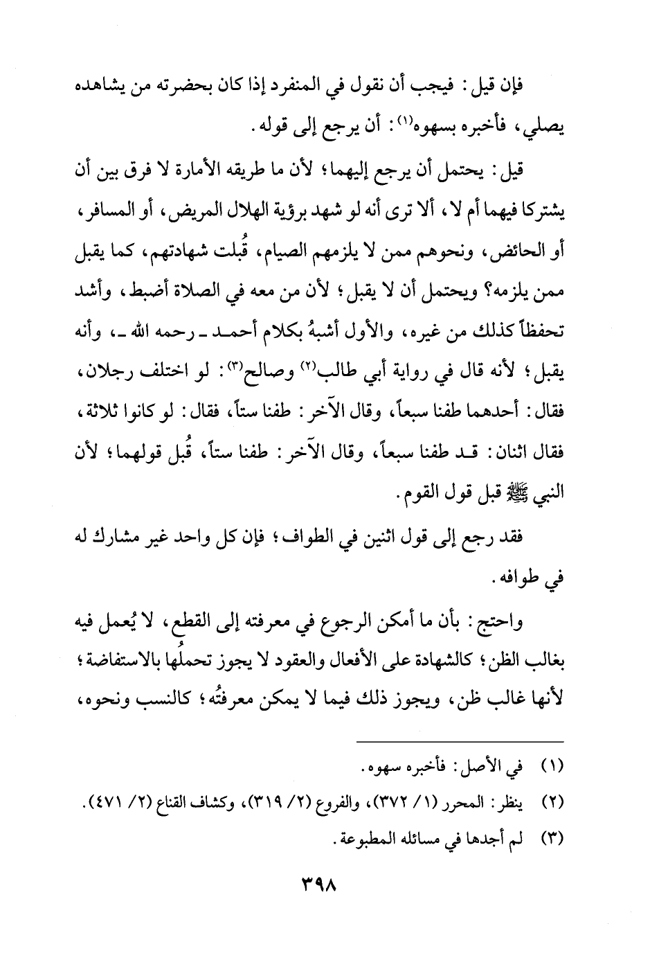 قيل: يحتمل أن يرجع إليهما؛ لأن ما طريقه الأمارة لا فرق بين أن يشتركا فيهما أم لا، ألا ترى أنه لو شهد برؤية الهلال المريض، أو المسافر، أو الحائض، ونحوهم ممن لا يلزمهم الصيام، قُبلت شهادتهم، كما يقبل ممن يلزمه؟ ويحتمل أن لا يقبل؛ لأن من معه في الصلاة أضبط، وأشد تحفظًا كذلك من غيره، والأول أشبهُ بكلام أحمد - رحمه الله -، وأنه يقبل؛ لأنه قال في رواية أبي طالب (¬2) وصالح (¬3): لو اختلف رجلان، فقال: أحدهما طفنا سبعًا، وقال الآخر: طفنا ستًا، فقال: لو كانوا ثلاثة، فقال اثنان: قد طفنا سبعًا، وقال الآخر: طفنا ستًا، قُبل قولهما؛ لأن النبي - صلى الله عليه وسلم - قبل قول القوم.