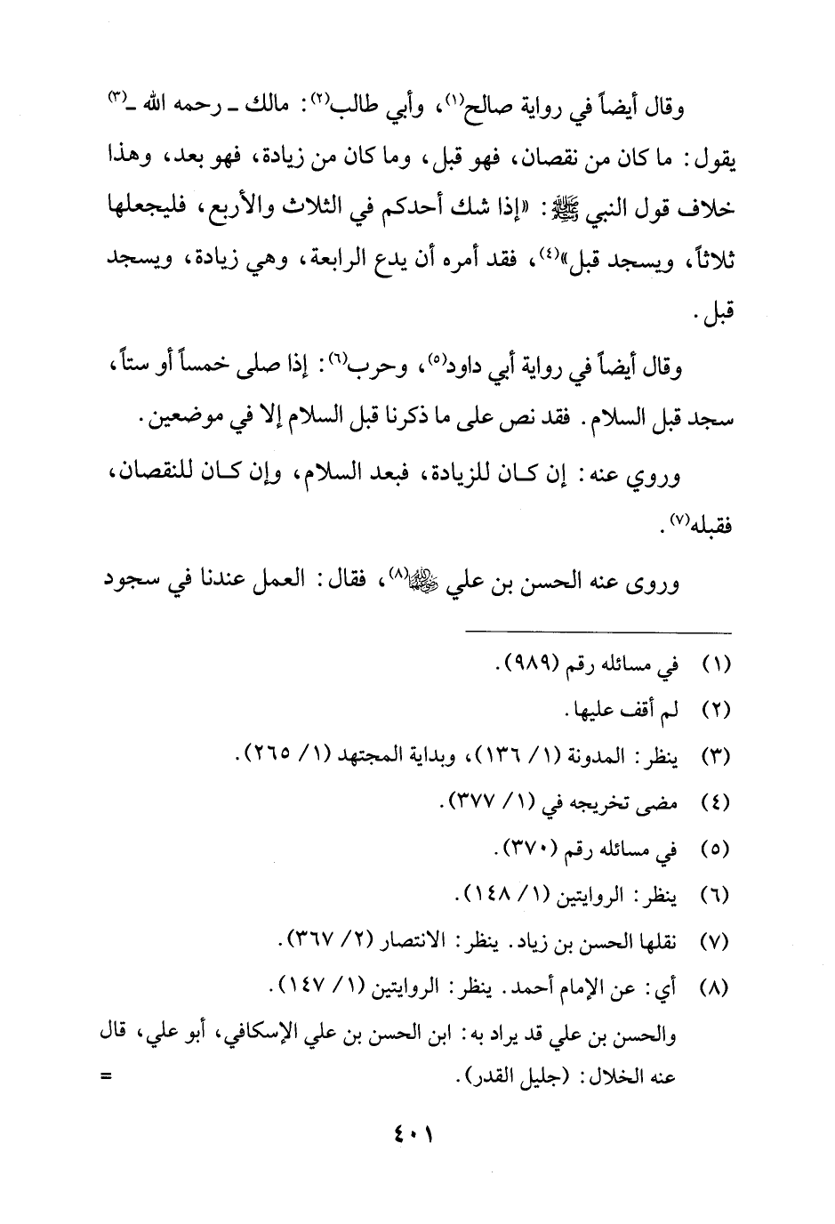 وقال أيضًا في رواية صالح (¬1)، وأبي طالب (¬2): مالك - رحمه الله - (¬3) يقول: ما كان من نقصان، فهو قبل، وما كان من زيادة، فهو بعد، وهذا خلاف قول النبي - صلى الله عليه وسلم -: "إذا شك أحدكم في الثلاث والأربع، فليجعلها ثلاثًا، ويسجد قبل" (¬4)، فقد أمره أن يدع الرابعة، وهي زيادة، ويسجد قبل.