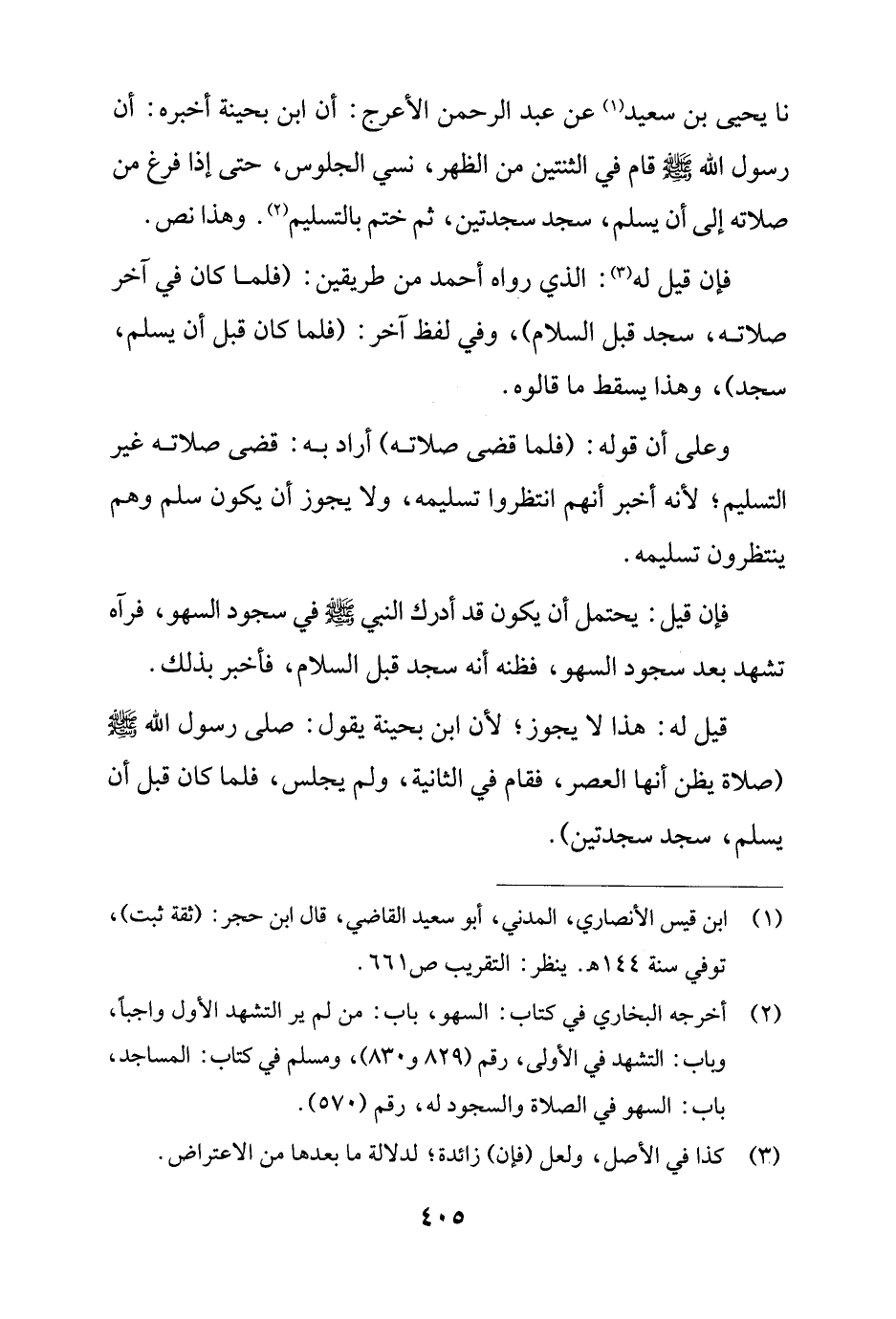نا يحيى بن سعيد (¬1) عن عبد الرحمن الأعرج: أن ابن بحينة أخبره: أن رسول الله - صلى الله عليه وسلم - قام في الثنتين من الظهر، نسي الجلوس، حتى إذا فرغ من صلاته إلى أن يسلم، سجد سجدتين، ثم ختم بالتسليم (¬2). وهذا نص.