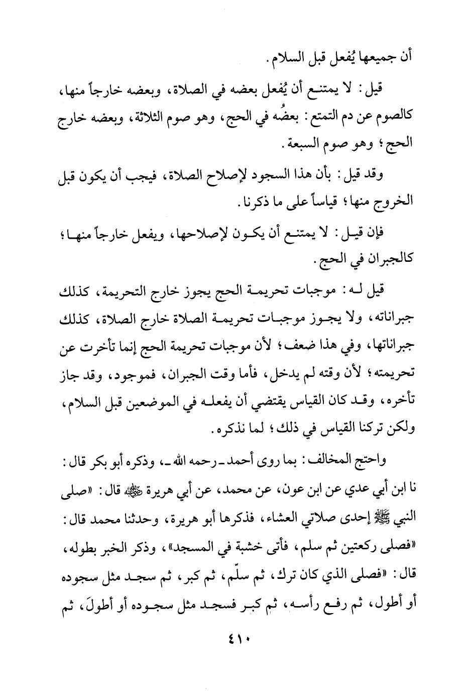 قيل له: موجبات تحريمة الحج يجوز خارج التحريمة، كذلك جبراناته، ولا يجوز موجبات تحريمة الصلاة خارج الصلاة، كذلك جبراناتها، وفي هذا ضعف؛ لأن موجبات تحريمة الحج إنما تأخرت عن تحريمته؛ لأن وقته لم يدخل، فأما وقت الجبران، فموجود، وقد جاز تأخره، وقد كان القياس يقتضي أن يفعله في الموضعين قبل السلام، ولكن تركنا القياس في ذلك؛ لما نذكره.
