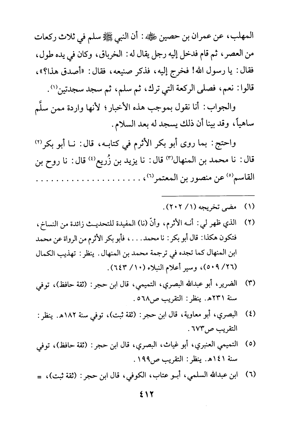 المهلب، عن عمران بن حصين - رضي الله عنه -: أن النبي - صلى الله عليه وسلم - سلم في ثلاث ركعات من العصر، ثم قام فدخل إليه رجل يقال له: الخرباق، وكان في يده طول، فقال: يا رسول الله! فخرج إليه، فذكر صنيعه، فقال: "أصدق هذا؟ "، قالوا: نعم، فصلى الركعة التي ترك، ثم سلم، ثم سجد سجدتين (¬1).