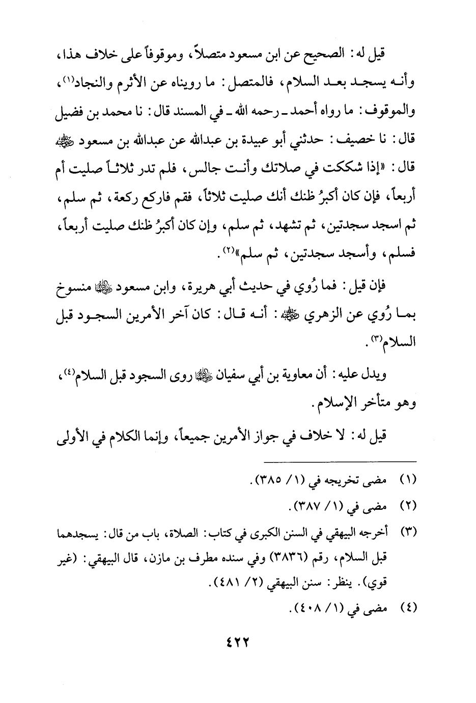 فإن قيل: فما رُوي في حديث أبي هريرة، وابن مسعود - رضي الله عنهما - منسوخ بما رُوي عن الزهري - رضي الله عنه -: أنه قال: كان آخر الأمرين السجود قبل السلام (¬3).