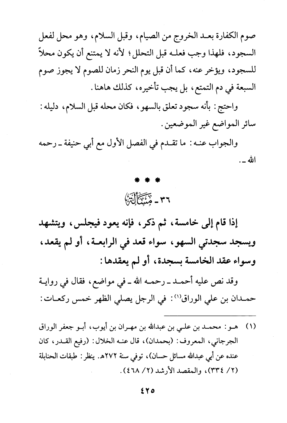 36 - مَسْألَة: إذا قام إلى خامسة، ثم ذكر، فإنه يعود فيجلس، ويتشهد ويسجد سجدتي السهو، سواء قعد في الرابعة، أو لم يقعد، وسواء عقد الخامسة بسجدة، أو لم يعقدها:
