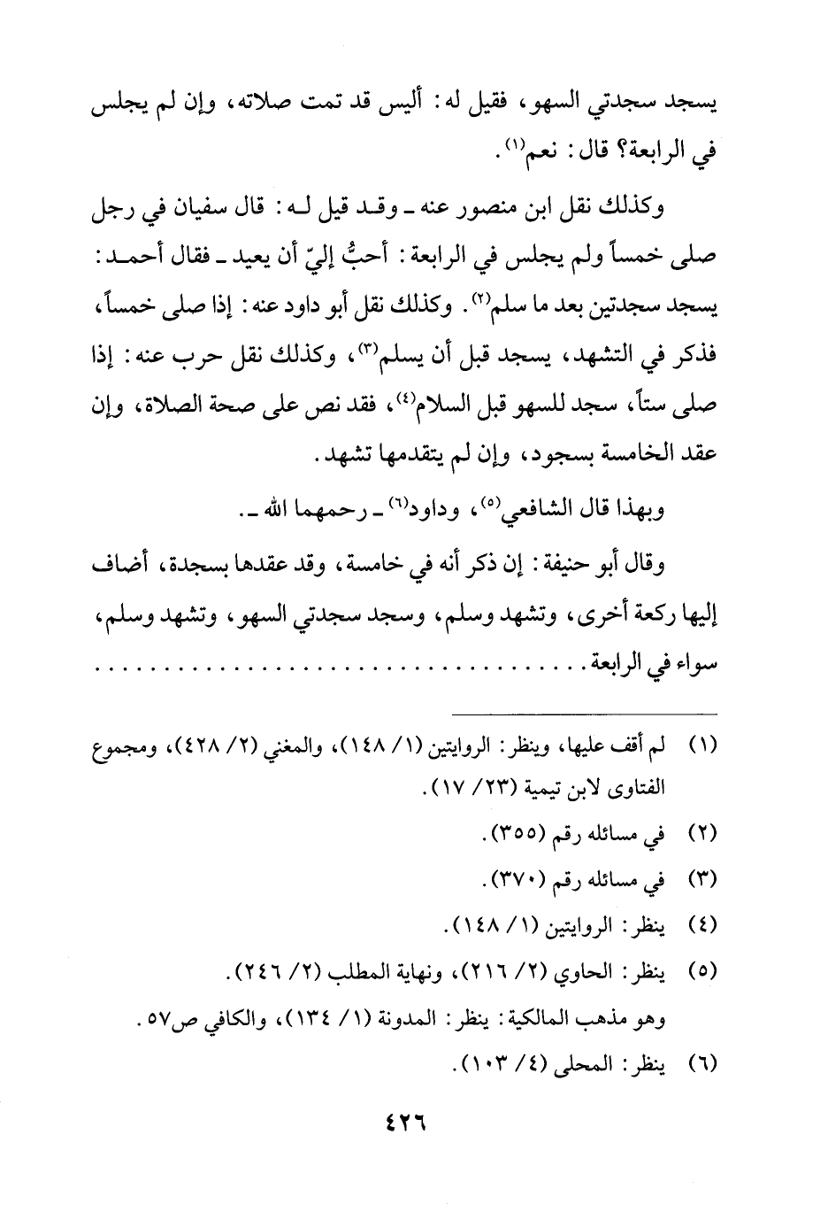 وكذلك نقل ابن منصور عنه - وقد قيل له: قال سفيان في رجل صلى خمسًا ولم يجلس في الرابعة: أحبُّ إليّ أن يعيد - فقال أحمد: يسجد سجدتين بعد ما سلم (¬2). وكذلك نقل أبو داود عنه: إذا صلى خمسًا، فذكر في التشهد، يسجد قبل أن يسلم (¬3)، وكذلك نقل حرب عنه: إذا صلى ستًا، سجد للسهو قبل السلام (¬4)، فقد نص على صحة الصلاة، وإن عقد الخامسة بسجود، وإن لم يتقدمها تشهد.