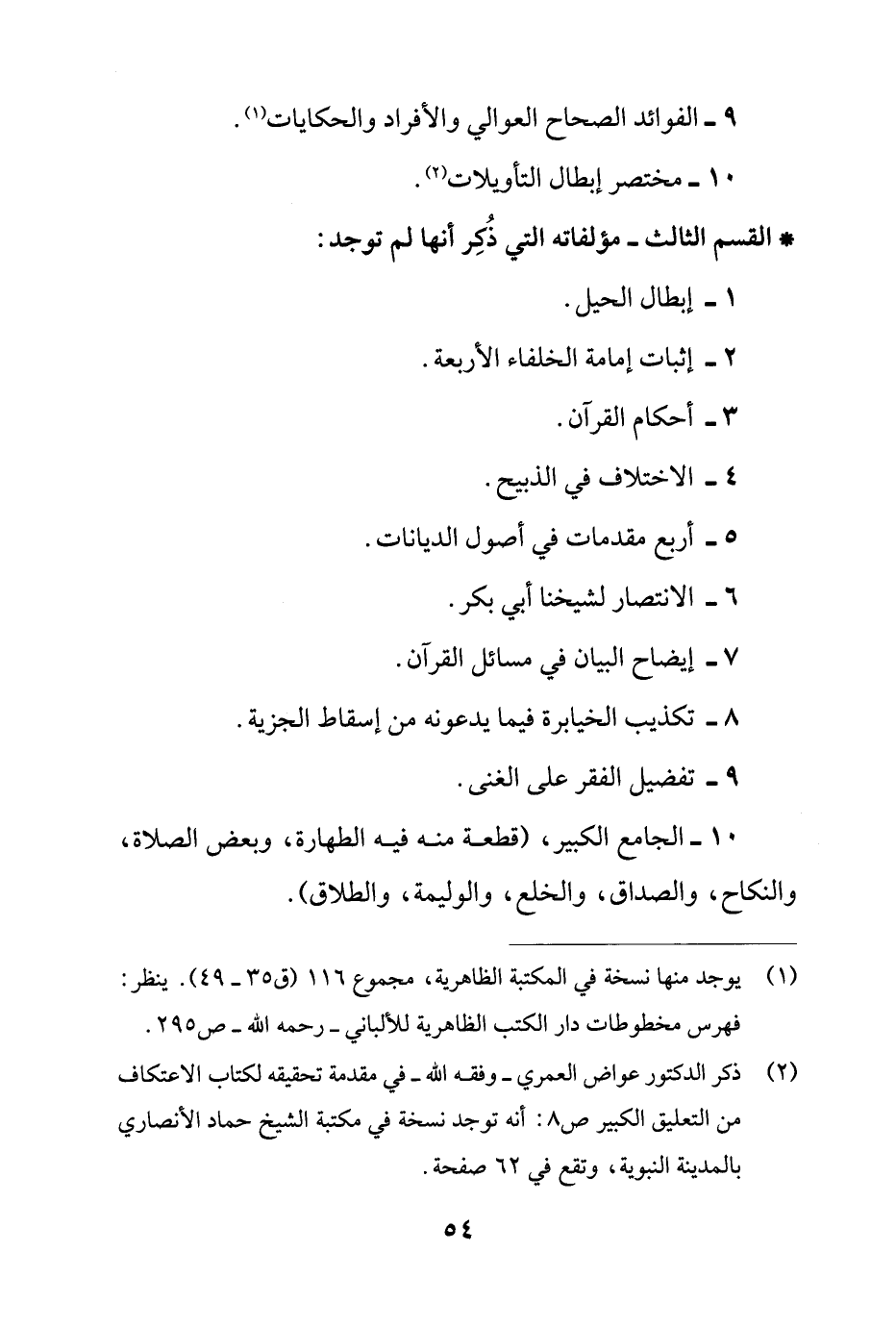 (¬1) يوجد منها نسخة في المكتبة الظاهرية، مجموع 116 (ق 35 - 49). ينظر: فهرس مخطوطات دار الكتب الظاهرية للألباني - رحمه الله - ص 295.