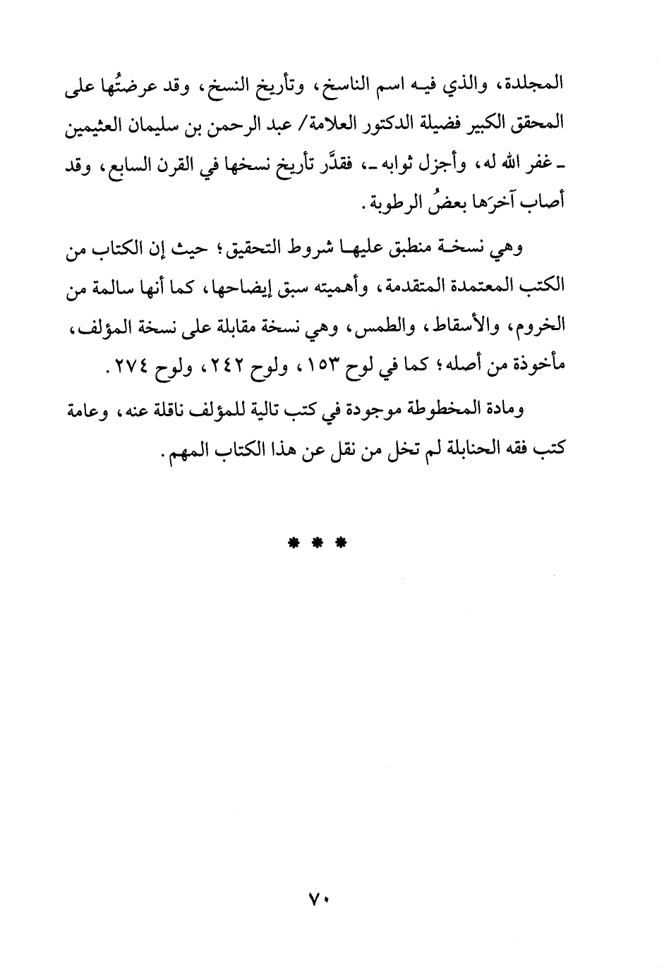 المجلدة، والذي فيه اسم الناسخ، وتاريخ النسخ، وقد عرضتُها على المحقق الكبير فضيلة الدكتور العلامة/ عبد الرحمن بن سليمان العثيمين - غفر الله له، وأجزل ثوابه -، فقدَّر تاريخ نسخها في القرن السابع، وقد أصاب آخرَها بعضُ الرطوبة.
