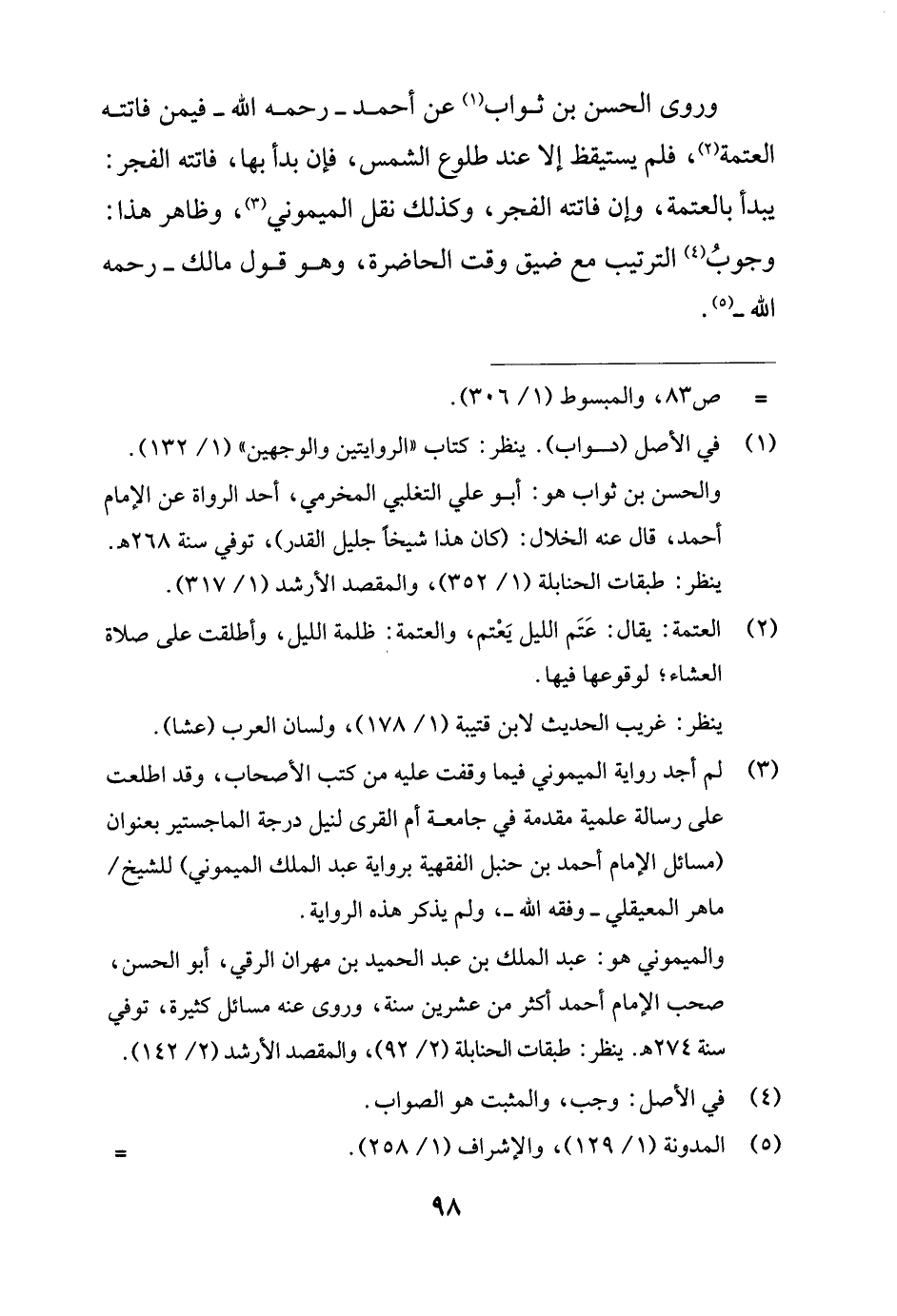 (¬3) لم أجد رواية الميموني فيما وقفت عليه من كتب الأصحاب، وقد اطلعت على رسالة علمية مقدمة في جامعة أم القرى لنيل درجة الماجستير بعنوان (مسائل الإمام أحمد بن حنبل الفقهية برواية عبد الملك الميموني) للشيخ/ ماهر المعيقلي - وفقه الله -، ولم يذكر هذه الرواية.