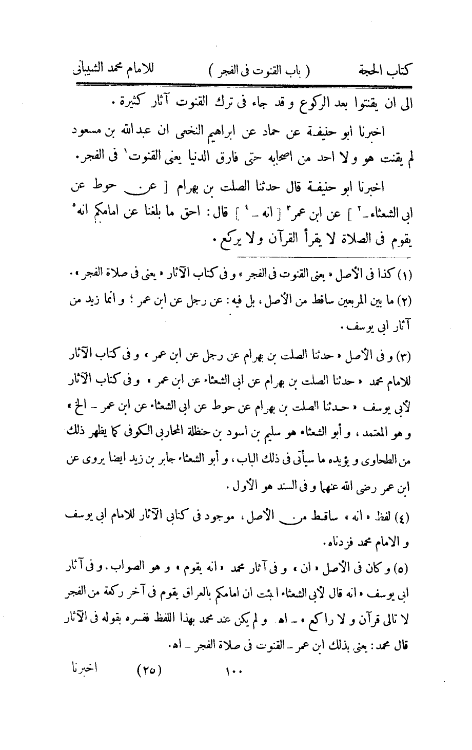 اُخْبُرْنَا أَبُو حنيفَة عَن حَمَّاد عَن إِبْرَاهِيم النَّخعِيّ أَن عبد الله بن مَسْعُود لم يقنت هُوَ وَلَا أحد من أَصْحَابه حَتَّى فَارق الدُّنْيَا يَعْنِي الْقُنُوت فِي الْفجْر