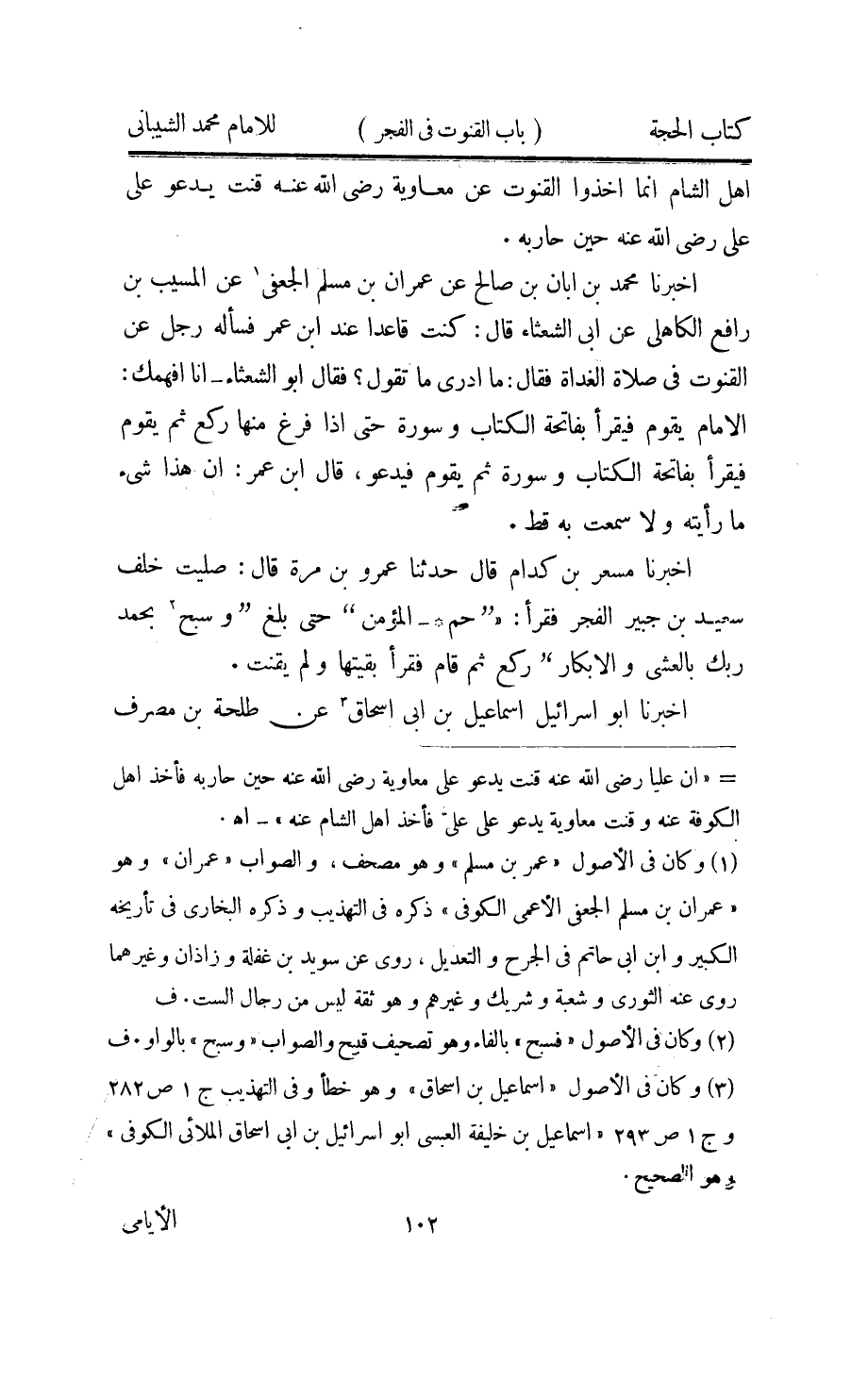 اُخْبُرْنَا مُحَمَّد بن إبان بن صَالح عَن عمرَان بن مُسلم الْجعْفِيّ عَن الْمسيب بن رَافع الْكَاهِلِي عَن أبي الشعْثَاء قَالَ كنت قَاعِدا عِنْد أبن عمر فَسَأَلَهُ رجل عَن الْقُنُوت فِي صَلَاة الْغَدَاة فَقَالَ مَا أدرى مَا تَقول فَقَالَ أَبُو الشعْثَاء أَنا أفهمك الامام يَقُول فَيقْرَأ بِفَاتِحَة الْكتاب وَسورَة حَتَّى اذا فرغ مِنْهَا ركع ثمَّ يقوم فَيقْرَأ بِفَاتِحَة الْكتاب وَسورَة ثمَّ يقوم فيدعو قَالَ أبن عمر أَن هَذَا شئ مَا رَأَيْته وَلَا سَمِعت بِهِ قطّ