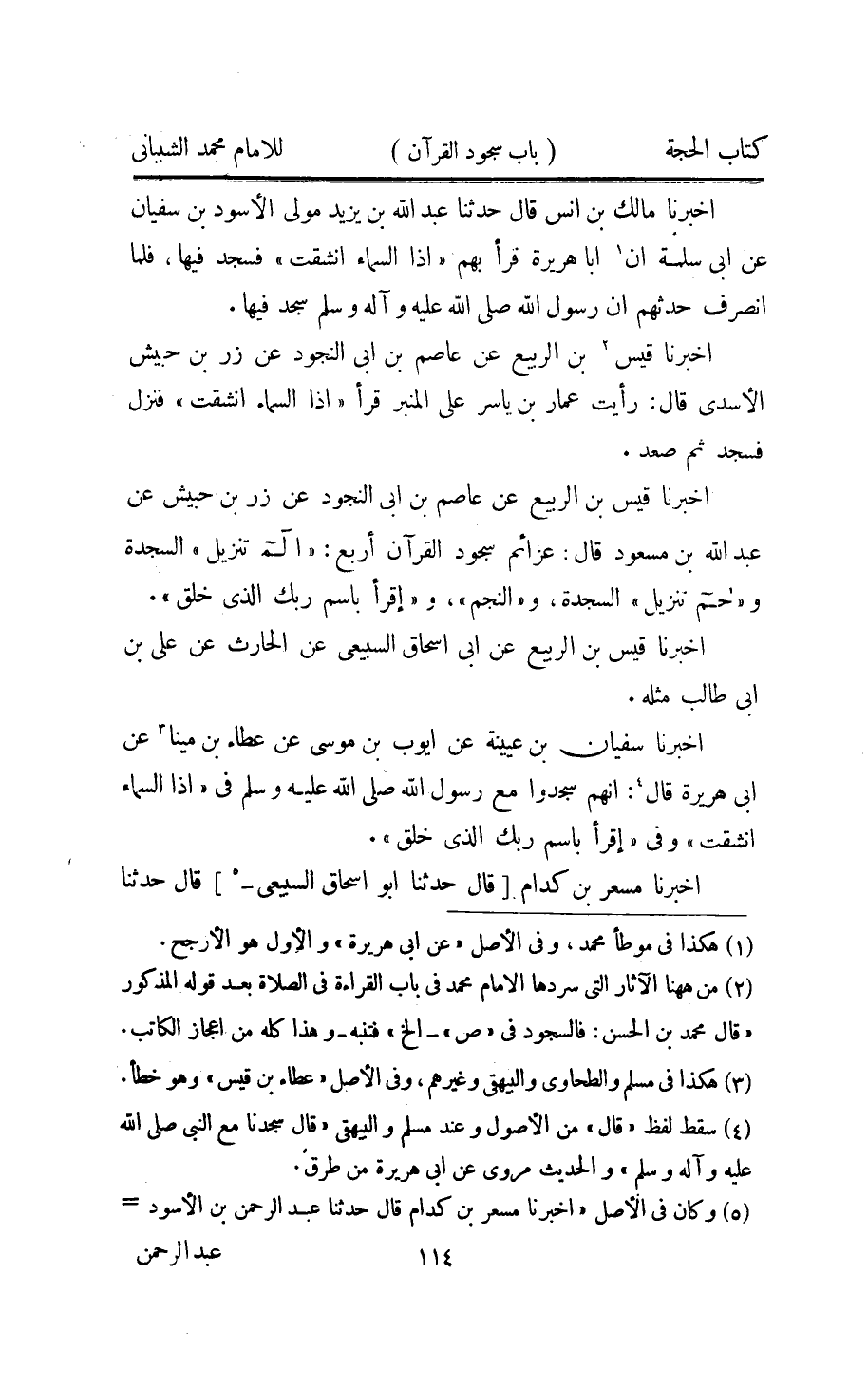 اُخْبُرْنَا قيس الرّبيع عَن عَاصِم بن ابي النجُود عَن زر بن حُبَيْش عَن عبد الله بن مَسْعُود قَالَ عزائم سُجُود الْقُرْآن أَربع الم تَنْزِيل السَّجْدَة وحم تَنْزِيل السَّجْدَة والنجم وإقرا باسم رَبك الَّذِي خلق