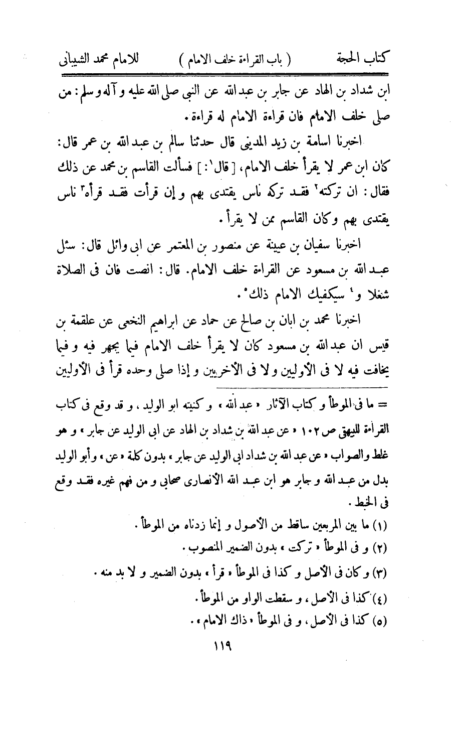 اُخْبُرْنَا مُحَمَّد بن ابان بن صَالح عَن حَمَّاد عَن ابراهيم النَّخعِيّ عَن عَلْقَمَة بن قيس ان عبد الله بن مَسْعُود كَانَ لَا يقْرَأ خلف الامام فِيمَا يجْهر فِيهِ وَفِيمَا يُخَافت فِيهِ لَا فِي الاوليين وَلَا فِي الاخريين واذا صلى وَحده قَرَأَ فِي الاوليين
