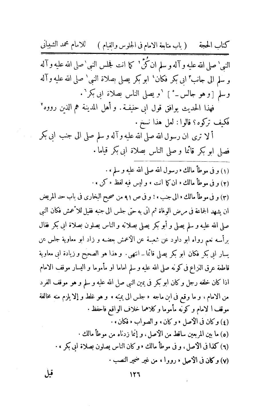 الا ترى ان رَسُول الله صلى الله عَلَيْهِ واله وَسلم صلى الى جنب ابي بكر فصلى ابو بكر قَائِما وَصلى النَّاس بِصَلَاة ابي بكر قيَاما
