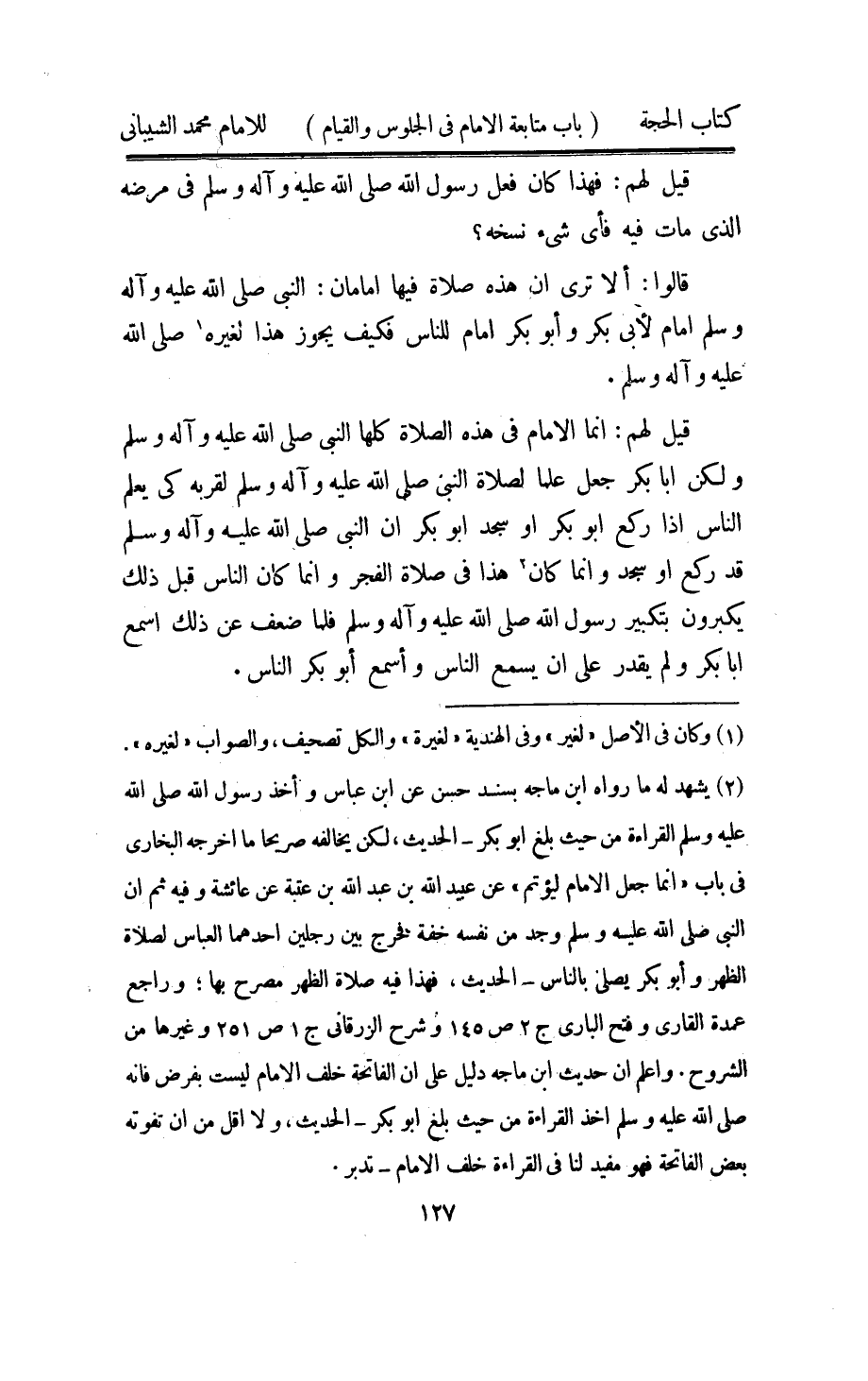 قَالُوا الا ترى ان هَذِه صَلَاة فِيهَا امامان النَّبِي صلى الله عَلَيْهِ واله وَسلم امام لابي بكر وابو بكر امام للنَّاس فَكيف يجوز هَذَا لغيره صلى الله عَلَيْهِ واله وَسلم