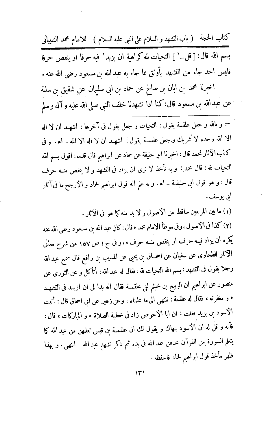 اُخْبُرْنَا مُحَمَّد بن ابان بن صَالح عَن حَمَّاد بن ابي سُلَيْمَان عَن شَقِيق بن سَلمَة عَن عبد الله بن مَسْعُود قَالَ كُنَّا اذا تشهدنا خلف النَّبِي صلى الله عَلَيْهِ واله وَسلم
