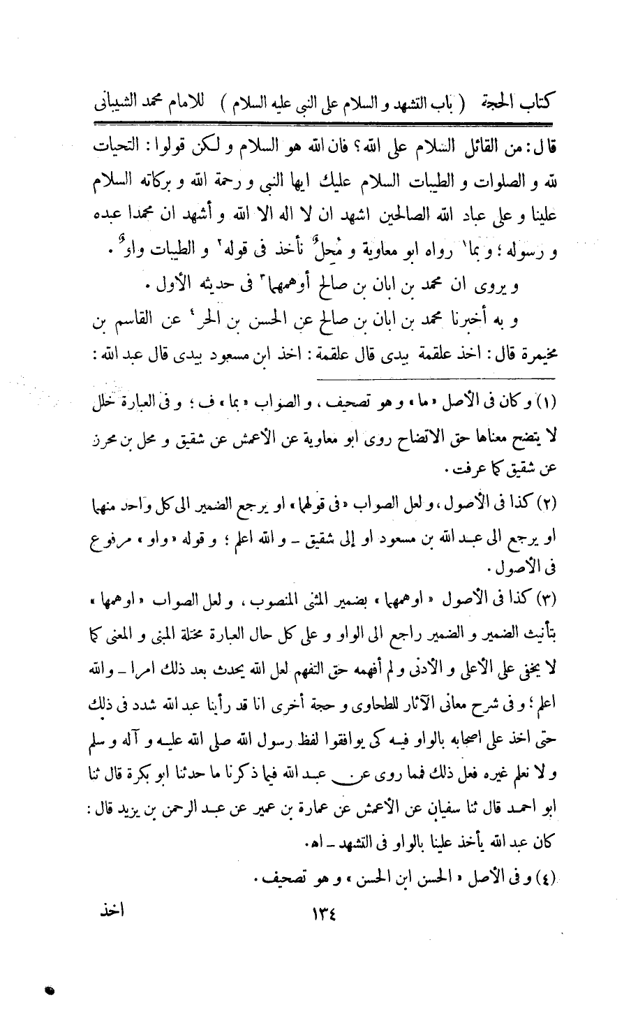 قَالَ من الْقَائِل السَّلَام على الله فان الله هُوَ السَّلَام وَلَكِن قُولُوا التَّحِيَّات لله والصلوات والطيبات السَّلَام عَلَيْك ايها النَّبِي وَرَحْمَة الله وَبَرَكَاته السَّلَام علينا وعَلى عباد الله الصَّالِحين اشْهَدْ ان لَا اله الا الله واشهد ان مُحَمَّد عَبده وَرَسُوله وَبِمَا رَوَاهُ أَبُو مُعَاوِيَة وَمحل نَأْخُذ فِي قَوْله والطيبات وَاو